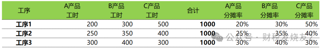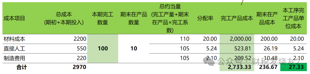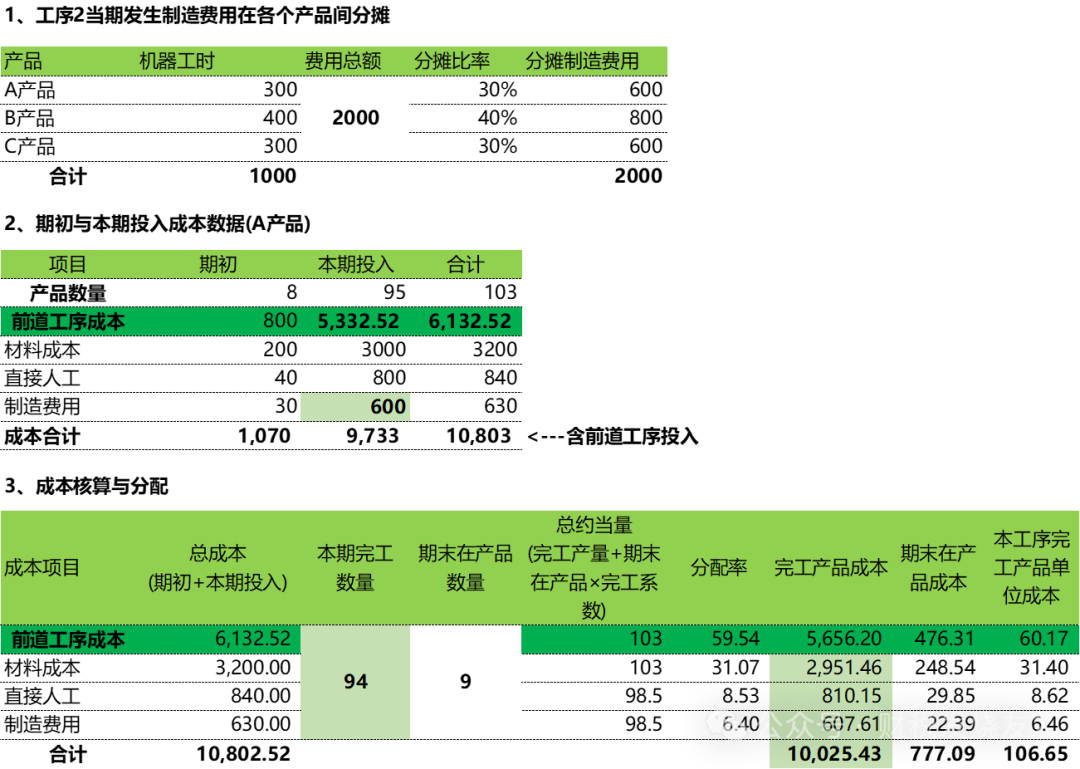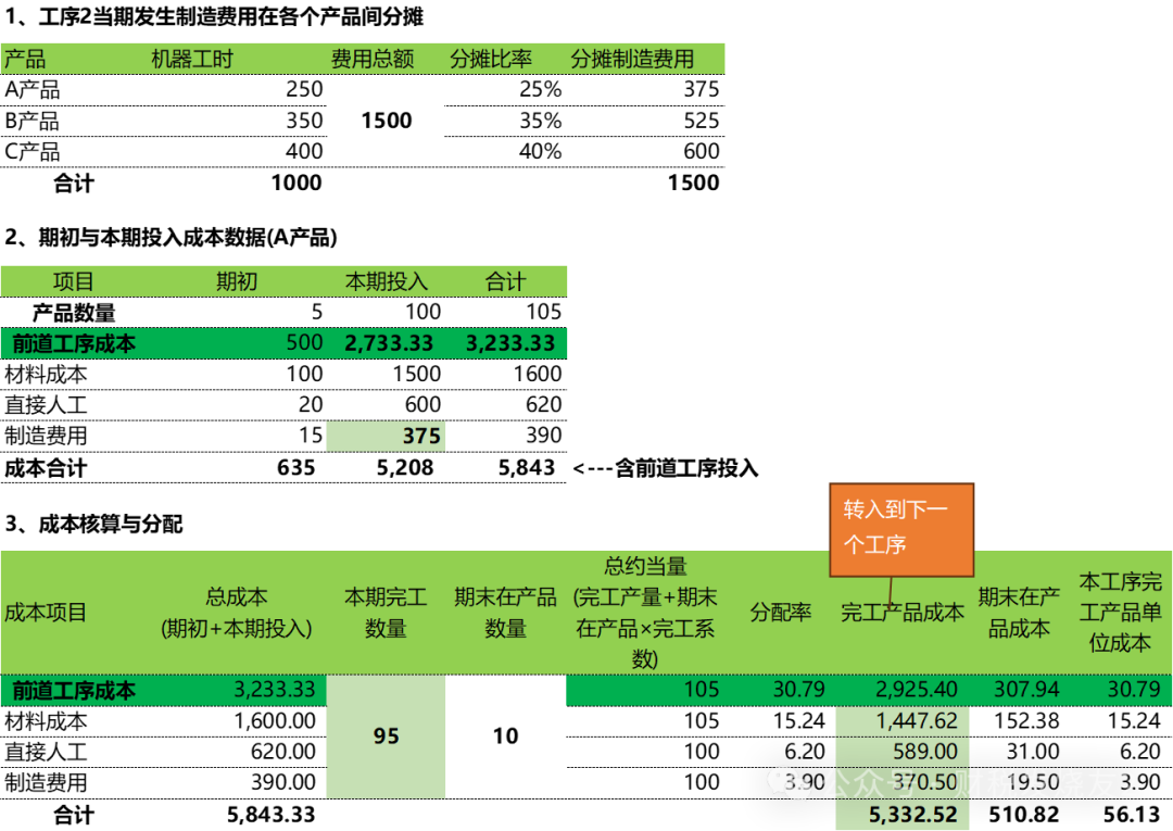 分步法是在《品种法》的基础上面进行了思维的升级,在产品品种的维度上面+生产步骤这个维度,所以难度系数大大加深生产A、B、C三种产品,需依次经过工序1、2、3。1、原材料:各工序开始时100%投入,每个工序都会投入,按数量1:1分摊。2、直接人工:持续投入(投入方式),按约当产量(完工率50%)在完工产品与在产品间分摊。3、制造费用:持续投入(投入方式),每个工序都是A、B、C产品共用制造费用,所以先要将制造费用按照机器工时分摊到A、B、C产品;然后按照约当产量法在完工产品与在产品间进行分摊;4、工序衔接:前1工序的完工产品投入到下一个工序进行继续生产;当然我们只要掌握了基本的逻辑,其他变体逻辑是相通;1)A产品在各个工序的投产数据统计(以A产品为例进行计算)实务中当然可能存在不一定全部移送到下一工序,可能会放到【半成品仓库】2)制造费用各个工序的机器工时统计如下(制造费用按照机器工时在各个产品间进行分摊。)以上是背景资料,在实务中要有大量的统计和沟通工作,是成本核算的基础工作,占整个成本核算的90%的工作量和重要性接下来就是成本核算的剩下的10%的工作量-成本核算了以A产品为例进行说明(这些数据也是实务中统计出来的。)其中制造费用的【本期投入】金额就是取得上面【工序1当期发生制造费用在各个产品间分摊】中的产品A分摊的金额200;本表数据主要取自上面表【期初与本期投入成本数据(A产品)】中的数据1)材料成本对应的约当总量=100+10×100%=110(因为原材料都是在开始时一次性100%投入。)其对应分配率=2200/110=20;完工产品对应的材料成本=完工数量100×20=2000,期末在产品=2200-2000=2002)直接人工/制造费用对应的约当总量=100+10×50%=105所以直接人工对应的分配率=550/105=5.24;完工产品对应的直接成本=完工数量100×5.24=523.81,期末在产品=550-523.81=26.19完工产品对应的制造费用=完工数量100×2.1=209.52(这里应该是210,因为小数点的原因),期末在产品=220-209.52=10.48到这里工序1的成本核算就结束了,是不是跟品种法的逻辑是一样一样的;唯一不同的是成本项目中多一个【前道工序成本】承接上一道工序转入的完工产品到这个工序我们就可以计算出来最终的产品成本为106.65/个