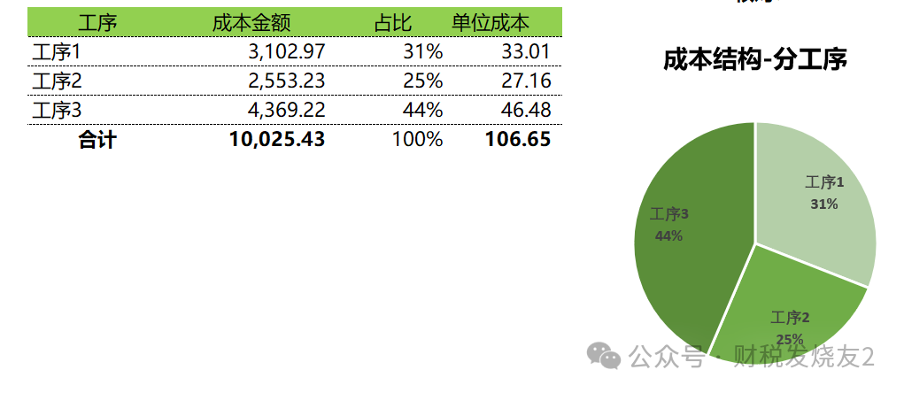 这个产品成本占比最大的是前道工序成本,占比56%,这个结构对于管控工序3是有意义的,但是对于公司更想知道这个完工产品中真正的料工费各占比多少于是我们需要进行成本还原动作-就是把最后1道工序中的前道工序成本进行还原为真正的料工费我们从工序3开始,因为完工成品中有前道工序的成本5656.2就是依据什么将这5656.2分摊到工序2中的成本项目结构呢?我们依据上一个工序完工产品的各成本项目占比进行还原比如工序2中的完工产品中的前道工序成本占比=2,925.40/5,332.52=54.9%;同样的方法可以计算出材料成本占比=27.1%;直接人工占比=11%;制造费用占比=6.9%;所以工序3中的前道工序的成本5656.2还原到工序的过程:前道工序成本=5656.2×54.9%=3102.97材料成本=5656.2×27.1%=1535.49然后继续将工序2中的前道工序成本3102.97继续还原到工序1的成本项目构成还原成功后就将工序3、工序2和工序2的料工费加起来就有了最终完工产品的料工费金额:当然我们也可以计算出完工产品成本中每个工序的成本占比: