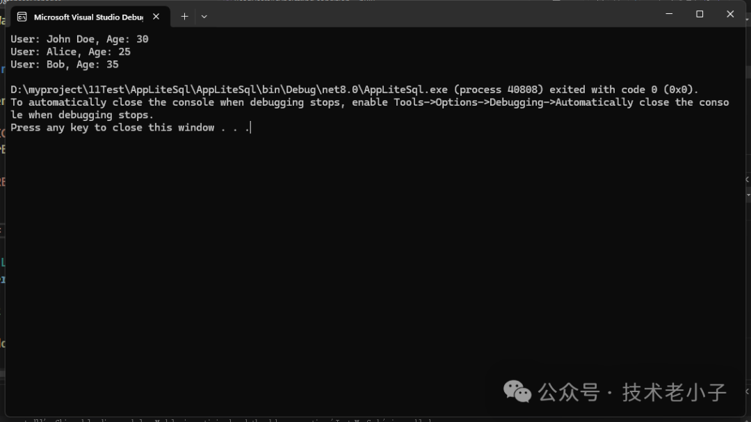 namespace AppLiteSql { internal classProgram { static async Task Main(string[] args) { AdvancedDatabaseManager dbManager = new AdvancedDatabaseManager("D:\\myproject\\11Test\\AppLiteSql\\db"); // 写入单个用户 var newUser = new User { Name = "John Doe", Age = 30 }; int newUserId = await dbManager.WriteUserAsync(newUser); // 批量写入用户 var userList = new List<User> { new User { Name = "Alice", Age = 25 }, new User { Name = "Bob", Age = 35 } }; await dbManager.BulkWriteUsersAsync(userList); // 读取用户 var users = await dbManager.ReadUsersAsync("Age > 20"); foreach (var user in users) { Console.WriteLine($"User: {user.Name}, Age: {user.Age}"); } // 更新用户 var updatedUser = new User { Name = "John Smith", Age = 31 }; await dbManager.UpdateUserAsync(newUserId, updatedUser); } } }