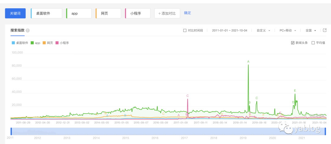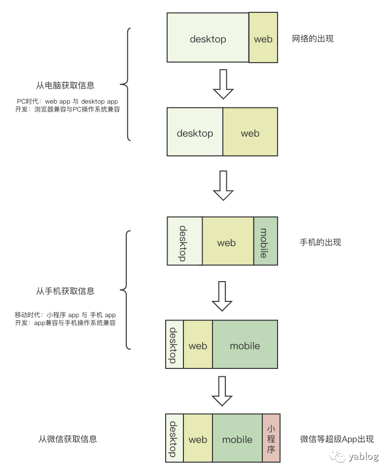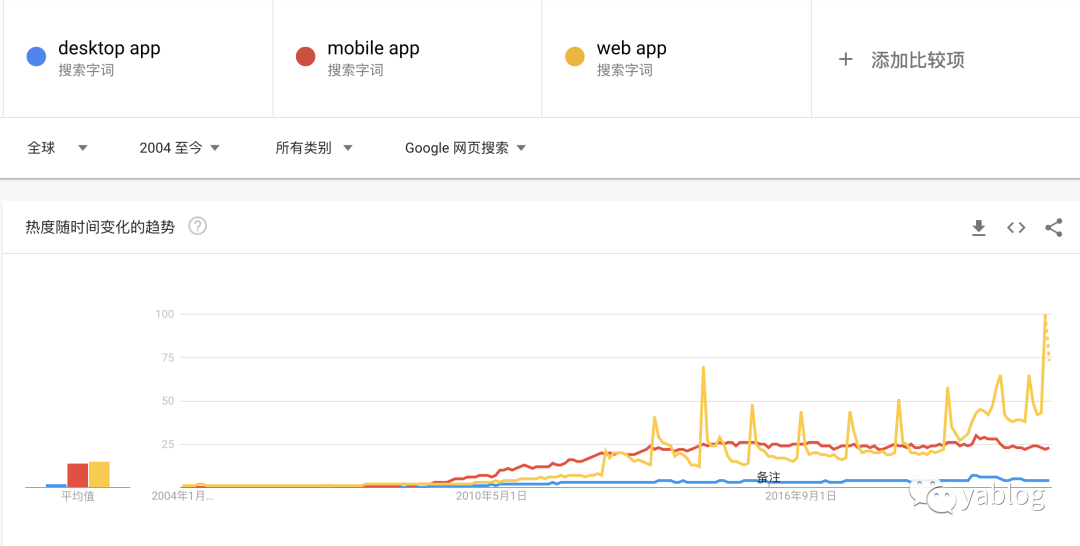 图5 应用软件形式分化历史 随着『发布』信息的设备不断演化与变迁,应用软件从最初的桌面软件形式,逐渐发展为桌面软件、Web 应用程序、移动应用程序三足鼎立的综合格局(小程序可归为移动应用程序之列)。虽然应用程序有此三大表现形式,但其所占比例却大为不同: 图6 应用软件各形式热度趋势 - Google Tends 图6 国内应用软件各形式热度趋势 - 百度指数 注:国内与全球趋势有细微差别((移动) App 与 Web App 份额均远大于桌面软件,但国内移动 App热度热度明显高于 Web App),同时为避免关键字带来的误差,笔者在通过微信指数查询结果与百度指数类似,在此就不列出了,读者可自行验证。 经过上面的宏观与微观分析,基本上可以得出下面三个结论:
