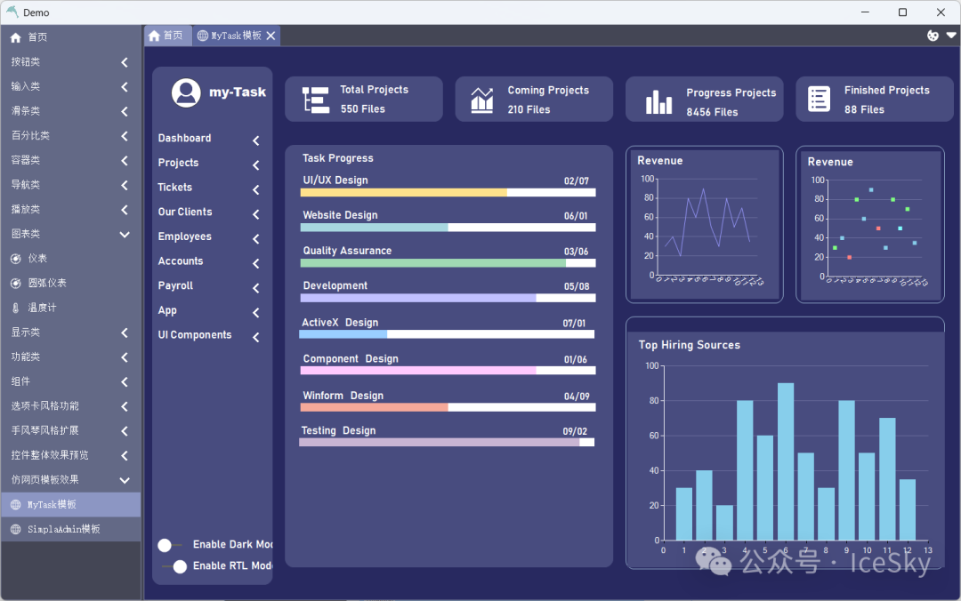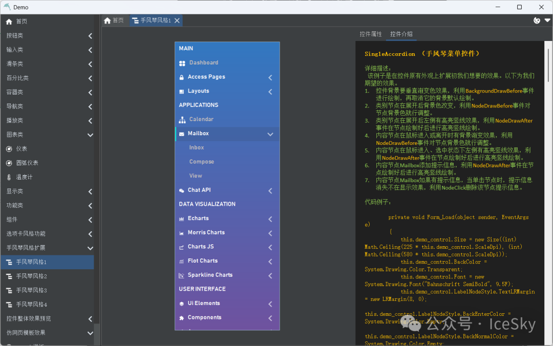 支持.net版本:.NET Framework4.0及以上 部分控件: 按钮 占比 手风琴 Task模板 Admin模板 SunnyUI 开源地址:https://gitee.com/yhuse/SunnyUI 特性:
