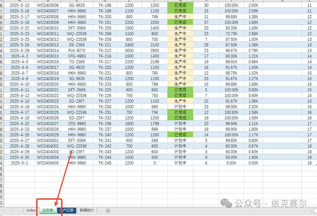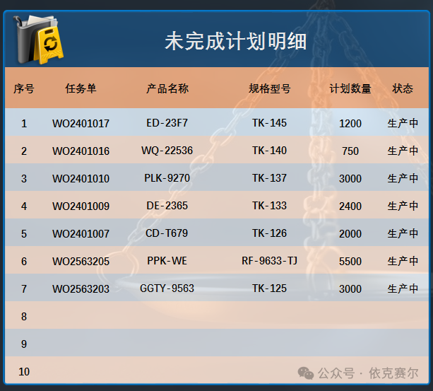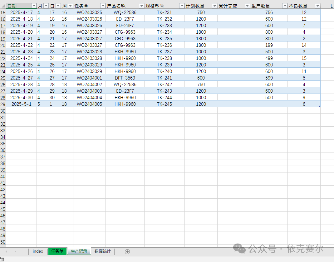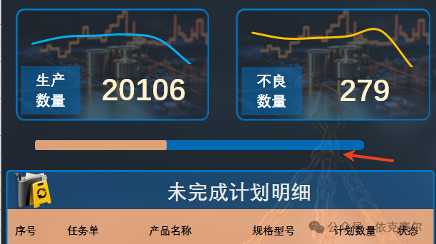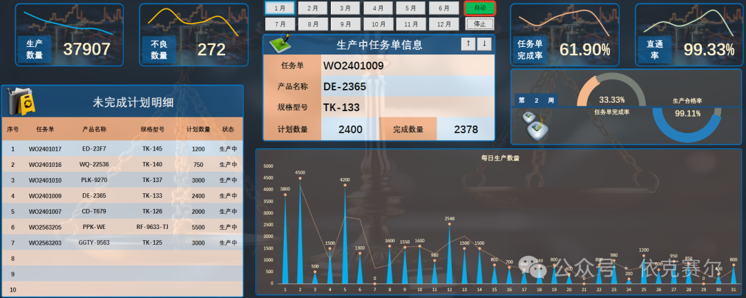 生产数据可视化看板 生产数据可视化看板3.5:生产数据可视化看板是一种直观、高效的工具,旨在帮助企业实时监控和分析生产过程中的关键数据。通过将复杂的生产数据转化为图表、动态图形,管理者能够快速掌握生产线的运行状态、设备效率、产品质量以及资源消耗等核心指标。看板支持多维度数据分析,帮助识别生产瓶颈、优化资源配置、提升生产效率,并支持决策制定。无论是实时监控还是历史数据回溯,生产数据可视化看板都能为企业提供清晰、 actionable 的洞察,助力实现智能制造和精益生产的目标。本期分享的生产数据可视化看板主要用于生产数据的实施更新和展示,并能实现一键循环展示生产任务状态以及相关的生产数据等信息。 1、月份切换:数据看板可通过月份按钮切换,切换后可查看对应月份的数据。月份切换后看板对应的统计数据自动切换到对应月份。 2. 数据统计:看板看板顶端四个矩形框统计当月对应的数据信息,其中矩形框的折线图表示当月对应每周的数据趋势信息。 2.1 生产中任务单信息:看板中心位置显示生产中的任务单信息,可通过右上方的向上和向下按钮切换查看。当前信息支持自动循环播放。 2.2 未完成计划明细:未完成计划明细显示当月所有为完成状态的任务单信息,当前信息也可一键循环播放查看。 2.3 生产数量统计:图表右下方通过柱状图的形式统计当月每日生产数量。 2.4 环形图:图表右侧通过两个环形图统计当月每周的任务单完成率和生产合格率,且周数可根据需要自动循环切换。 3 自动循环: 点击月份按钮右方的自动按钮,状态切换为“自动”看板信息可自动循环显示当月的数据,数据按指定的时间循环切换。如不需要自动切换,点击“停止”按钮即可,状态自动切换为停止。 3.1循环进度:以进度条的形式显示循环的进度。 4、任务单:新增任务单,只需要在任务单的工作表输入对应的任务单信息即可。任务单信息只需要输入日期、任务单、产品名称、规格型号和计划数量和状态即可,其他信息均可通过公式自动获取 5 生产记录:生产数据更新,在生产记录的工作表录入对应信息即可。 5.1 日期录入:在日期列双击空白工作表,可打开日期选择窗口,实现日期的快速录入。 5.2任务单信息:在任务单列双击空白单元格,可打开任务单信息选择窗口,双击需要录入放入的任务单信息后,自动添加到任务单信息录入位置。只需要输入生产数量和不良数量即可更新图表。 6、数据统计:数据统计工作表的公式如无必要切勿修改。