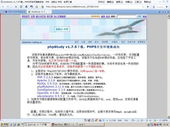 因为只是为了本地测试,不需要自己配置太多(难道还想在自己的电脑发布到外网不成=_+!),所以选用的是“龙的心”的phpStudy v1.7.5。不是最新的PHP的环境,但比较稳定,测试刚刚好,还简单。偶的一贯作风是:够用就行。