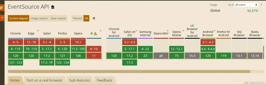 SSE的优点是,它是一个轻量级的协议,相对于websockte来说,他的复杂度就没有那么高,相对于客户端的消耗也比较少。而且SSE使用的是http协议(websocket使用的是ws协议),也就是现有的服务端都支持SSE,无需像websocket一样需要服务端提供额外的支持。注意哦,上图是SSE对于浏览器的兼容不是对于服务端的兼容。