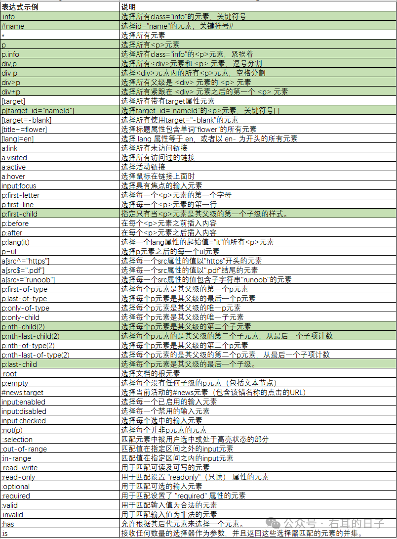 解释:选择div标签并带有box这种class的所有元素,并在其中查找id=chair的元素,即查找到<p id="chair">凳子</p>注意空格的位置,空格表示向下查找,找下面的所有后代元素,如:解释:查找id=couch的p元素,返回值是空,因为没有id=couch的div元素解释:查找div元素下面的id=bed的元素,返回值是<p id="bed">床</p>解释:查找div元素下面的class=box的所有元素,返回值是“客厅”、“餐厅”、“卧室”这个三个元素另外,还有一种情况也是经常遇到,就是>符号,也表示向下查找,不过查找的范围,仅查找当前节点下的子元素,不包括子元素的子元素。解释:查找class=box的div元素下面的子元素里包含class=furniture的元素,返回值是“沙发”、“凳子”这两个元素解释:查找class=box的div元素下面的所有后代元素里包含class=furniture的元素,返回“沙发”、“凳子”、“枕头”这三个元素div:nth-child(2) 在所有的div中取第二个最常用的,标注了绿色,学会这几个,后续组合起来也够用了:在百度页面的输入框,右键,选择属性,会弹出html结构。<input type="text" class="s_ipt" name="wd" id="kw" maxlength="100" autocomplete="off" placeholder="特朗普再次扬言要接管加沙">