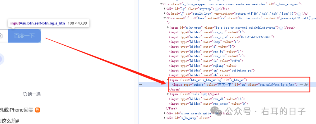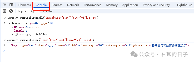 input[type="text"][name="wd"].s_ipt在浏览器的Console标签页,输入document.querySelectorAll('input[type="text"][name="wd"].s_ipt')查询到的元素列表,只有一个,说明使用这个方法确实能够找到这个唯一的元素。当然,你也可以使用document.querySelector('input[type="text"][name="wd"].s_ipt')直接获取到这个元素。input[type="submit"][value="百度一下"].btn在Console标签页里,输入以下代码并回车,会自动跳转到搜索结果页面。document.querySelector('input[type="text"][name="wd"].s_ipt').value="打工助手-数据录入辅助工具";