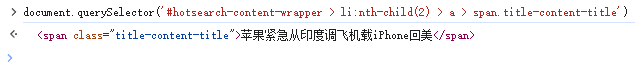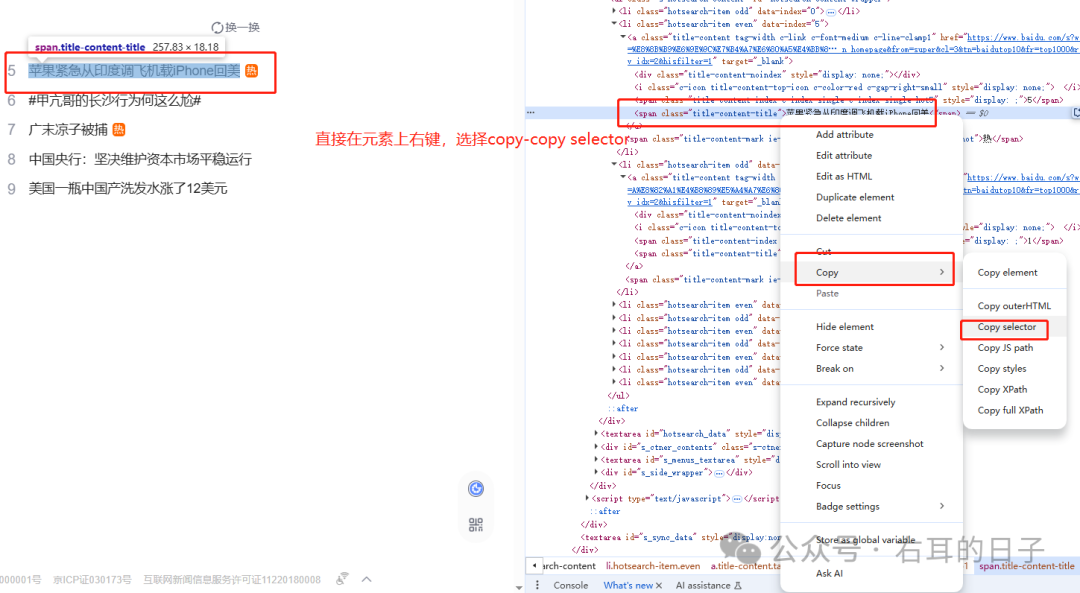 如果觉得上面的教程还是太复杂了,也有一种更简单的方法。可以在浏览器的html元素上,直接右键,在弹出的选项中选择“copy->copy selector”,再粘贴到文本框,这样也能得到浏览器帮你计算出来的selector。比如获取“5 苹果紧急从印度调飞机载iPhone回美”这个页面元素,通过简单法获取到的selector为:#hotsearch-content-wrapper > li:nth-child(2) > a > span.title-content-title使用document.querySelector('#hotsearch-content-wrapper > li:nth-child(2) > a > span.title-content-title'),同样可以验证获得的这个元素1、这种方法适用于没有复杂动态效果的简单页面,因为组装出来的selector是相对于整个html绝对定位的路径。2、对于现代常用vue、react或一些动态元素很多的页面,取到的selector不一定全部适用。因为这些网页的元素是动态生成的,有些元素可能在页面的第2个位置,点击某个按钮后,会变成第3个位置。