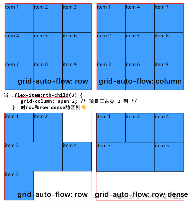 定义(容器元素默认是块级元素,但也可以通过inline-grid设成行内元素) - 项目:容器的直接子元素自动成为项目,容器包含一个或多个项目(仅第一层子元素参与布局)