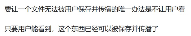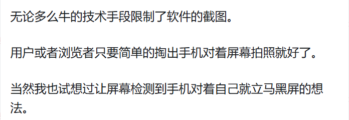 >>>河边贴上‘禁止游泳’的标识,并阻止不了真正想去游泳的人;前端禁止用户截图,可以制造一定的障碍,但无法抵挡用户层出不穷的手段。