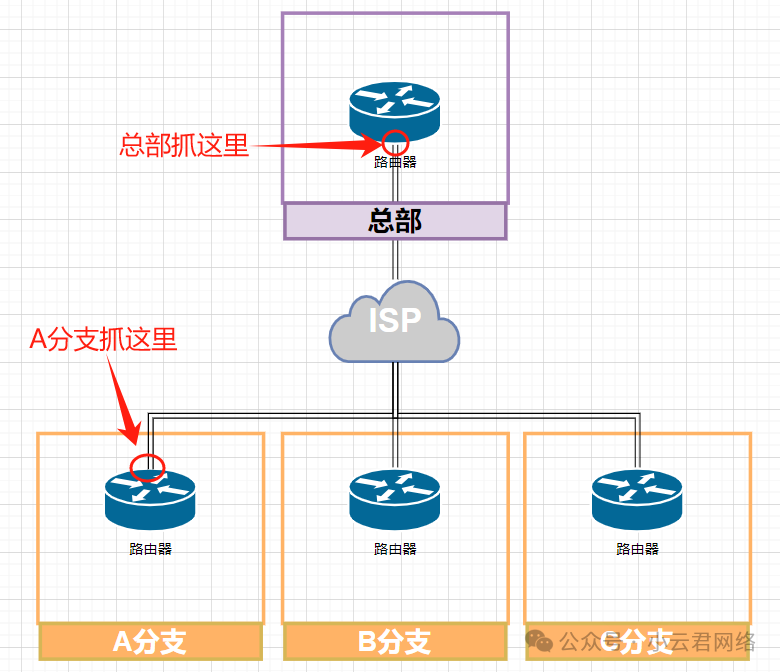 而总部和分支之间无法互访,说明ESP封装的数据报文大概是过不去的,所以基于这点抓取两边出口路由的WAN口报文比对即可;