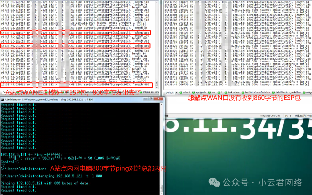 A分支发出的MSS=800字节(最大数据长度)的报文经过ESP封装后得到的864字节包从A路由发出去了,但是总部的WAN口没收到。说明中间链路丢包了。这边分别测试了MSS=1000、1200的都是如此。