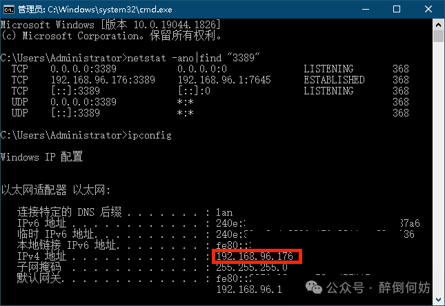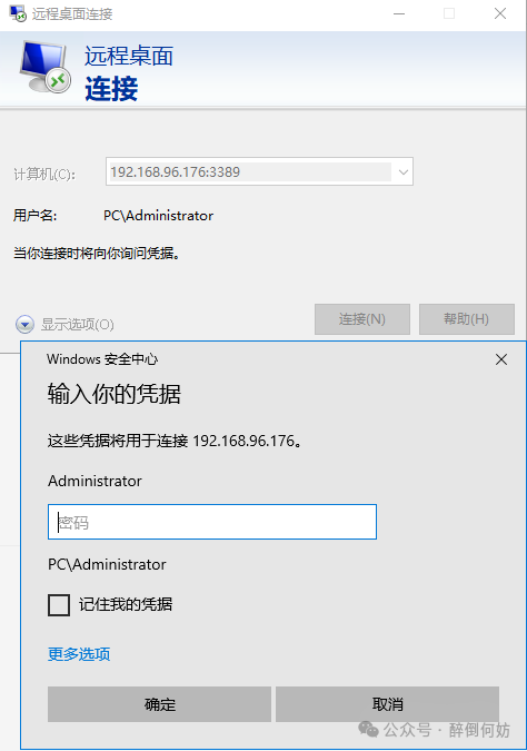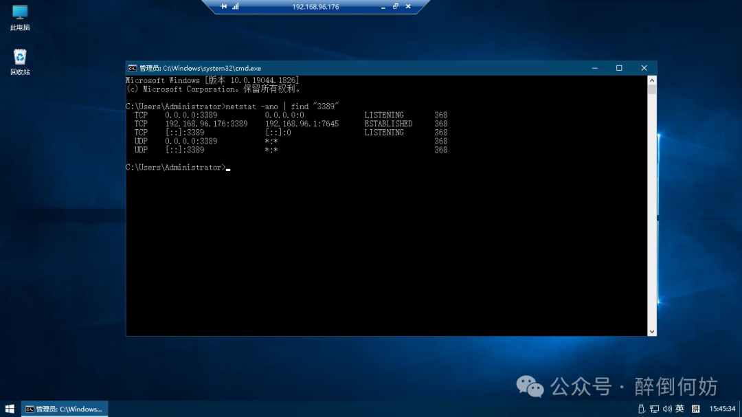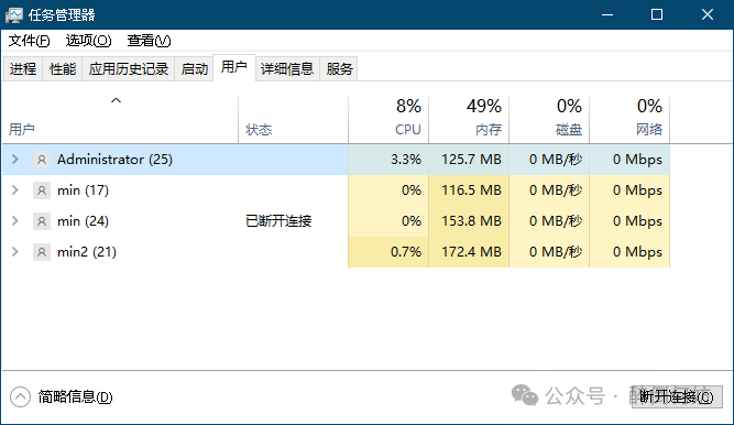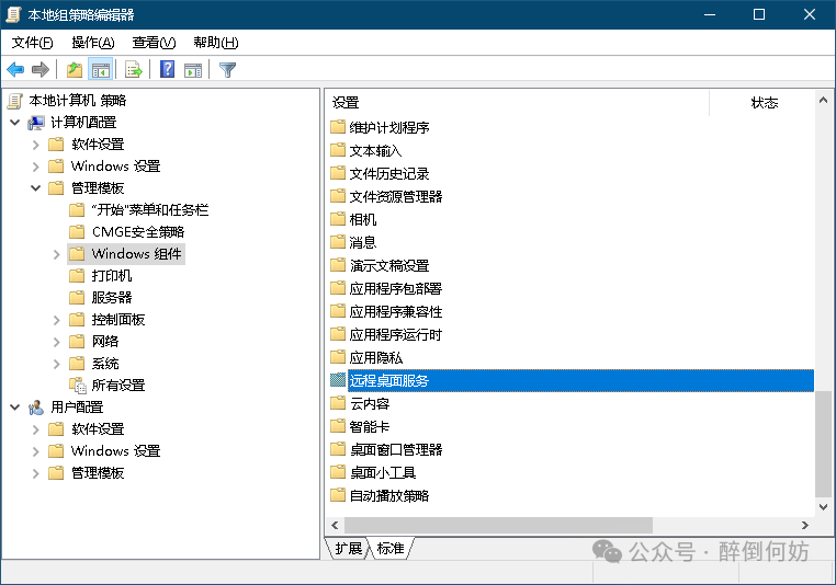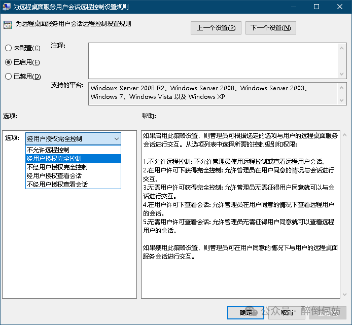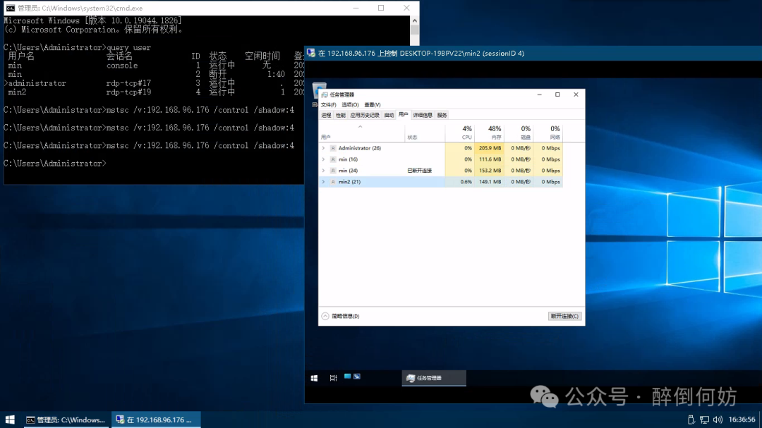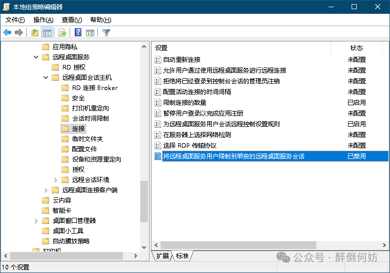从上图看到,这儿的 IP地址 是 192.168.96.176,这时可以找同一个网络里的另外一台电脑,用远程桌面的客户端测试一下是否可以连接了(需要从外网访问的,需要参考笔者的其它几篇文章,具体可在公众号后台与笔者沟通交流)。如下图所示,输入 192.168.96.176,点击连接,看到提示输入用户名密码的界面。输入正确的用户名、密码以后,成功登陆到远程桌面。就像使用本机一样方便。上面内容比较多,主要是为初学者讲解开启远程桌面服务的方法。但这不是本文的重点,我们今天要解决的问题,是如何让这样一个非服务器版本的 Windows 系统支持多个用户同时登陆使用,甚至是让一个用户会话去控制另外一个用户会话。首先,在开始菜单中找到组策略编辑器,或是在运行中输入 gpedit.msc在组策略编辑器,依次找到“计算机配置”-“管理模板”-“Windows 组件”-“远程桌面服务”-“远程桌面会话主机”-“连接”,路径比较长,按顺序一步一步找,具体如下面两个图。1、将远程桌面服务用户限制到单独的远程桌面服务会话,该项默认情况下会限制同一个用户只能登陆到同一个会话。需要设置为已禁用;2、为远程桌面服务用户会话远程控制设置规则,通常设置为已启用,并选择“经用户授权完全控制”。经过以上设置以后,Windows 原生的远程桌面服务就支持多用户登陆了。建议用不同的用户名登陆,如果是相同的用户名,通常一个会话是控制台,另一个会话才是远程桌面。不同的用户名,可以互不影响。现在测试用一个会话控制另一个会话的情况。步骤如下:query user