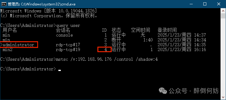用 query user 可以看到,当前会话为>administrator,当前会话在用户名前面有个">"标志,min2 用户的会话 ID 为4,这时如果要去控制这个会话,使用命令: