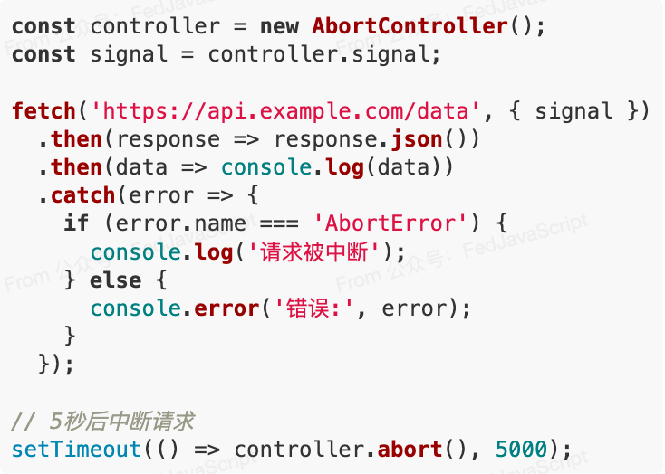 这使得处理各种类型的响应变得非常灵活。 中断请求通过 AbortController,fetch API 支持中断正在进行的请求: 此外,相比 Ajax,fetch API 原生支持跨域资源共享(CORS)。 注意事项尽管 fetch API 有很多优势,但也有一些需要注意的点: