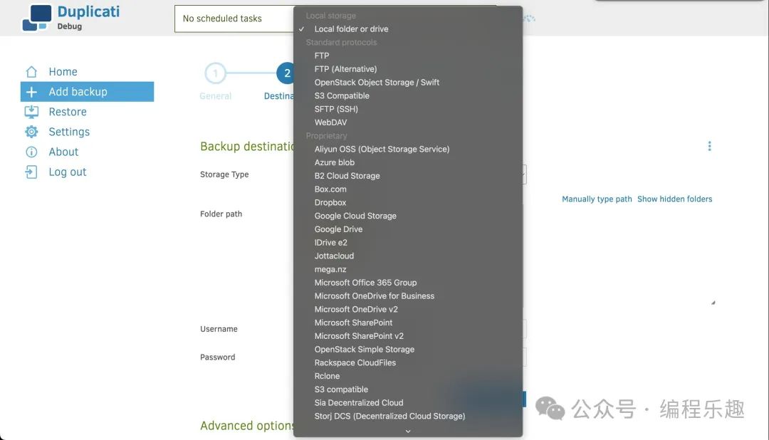 Duplicati 是一个跨平台的免费、开源的备份客户端,可以安全地将加密、增量、压缩的备份存储在云存储服务和远程文件服务器上。支持的云存储服务:亚马逊 S3、IDrive e2、Backblaze (B2)、Box、Dropbox、FTP、Google Cloud 和 Drive、MEGA、Microsoft Azure 和 OneDrive、Rackspace Cloud Files、OpenStack Storage (Swift)、Sia、Storj DCS、SSH (SFTP)、WebDAV、阿里云对象存储(OSS)、腾讯云对象存储 (COS)。
