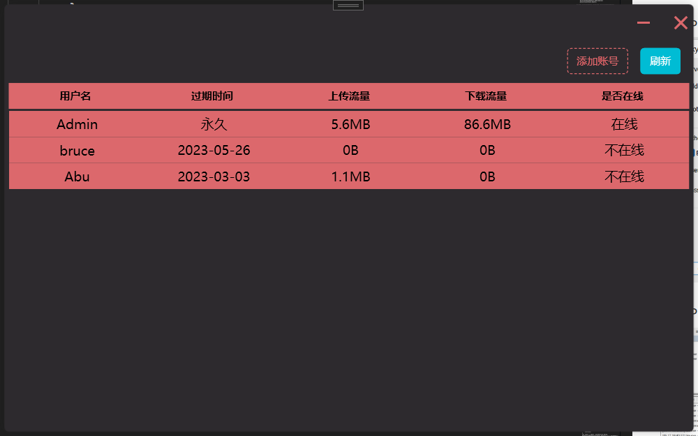 用户数据包括,用户名密码,使用流量,过期时间等存储在server端的sqlite数据库中。通过EFcore来增删改查。