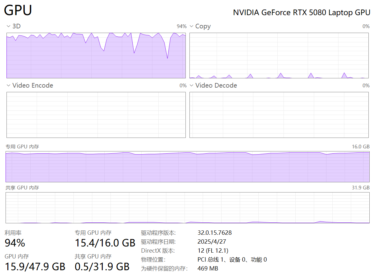 注意观察一下GPU使用情况,这里会很高。 RTX 5080显卡,16GB显存,几乎已经占满了。内存,大概用了30G左右 不过不要担心,大概持续30秒左右,GPU利用率会瞬间降到3%