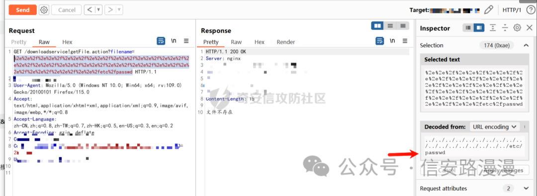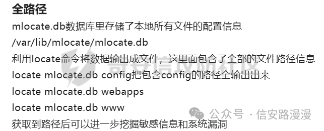 由于windows服务器特性,可以分盘操作,导致我们黑盒测试很难知道目标服务器是否存在其他盘符,即使知道了盘符也很难知道绝对路径,所以window系统很难利用此漏洞。 修复建议1、限定文件访问范围,在php.ini等配置文件中配置open__basedir限定文件访问范围 2、禁止客户端传递../这些敏感字符 3、文件放在web无法直接访问的目录下。 实战案例在点击文件下载的时候发现url格式如图所示,当输入任意字符时会返回文件不存在,如果输入存在的文件名则会直接下载文件 因为服务器是Linux系统,所以我们可以读取/etc/passwd文件来判断是否存在漏洞。依次进行 ../ 跳目录测试 发现测试了许久都是返回文件不存在,那可以考虑当前web程序可能存在防护了,一般开发者在代码层进行防护的话,一般都是过滤掉 . / 这种字符进行防护,根据上面提到的方式进行绕过处理 单次编码不行,那就继续在原来编码的基础上进行二次url编码,再测试一波,最终也是验证成功漏洞存在 验证漏洞存在了,如果是在未授权的情况下进行利用,那么可以直接提交漏洞了;如果在已授权情况下,还想进一步对漏洞进行利用更深入,那么可以考虑怎么进行更深入的利用呢。 我先是读取/root/.bash_history 内容,根据命令操作拼接路径,先是下载了目标网站的源码,我也是从源码中读到一些数据库账号密码等信息,可惜都是内网,我不能利用到。如果你是代码审计大牛,那么可以直接开始审计代码,从代码中挖掘漏洞,进行getShell。很显然我不是 后来我也是想着下载ssh公钥文件等思路,可惜的是,此目标网站只对外开放web服务端口,所以我无法进行其他服务的攻击利用。 既然从目标中获取权限不行,那我转换一下思路,通过漏洞获取数据,再从获得数据中提取信息,从而获取系统的更高权限。 Linux下有mlocate.db文件,此文件介绍如下,我可以下载这个文件,再从这个文件中获取其他文件的绝对地址,这样的话我就可以下载到目标服务器上任意的文件了 将获取到的全文件数据库解出明文,然后从明文中翻找重要文件进行下载 在计算机中,重要文件,无非就是数据和权限相关,所以我们主要找备份文件和数据库文件 .rar、.zip、.7z、.tar、.gz、.tar.gz、.bz2、.tar.bz2、.sql、.bak、.dat、.txt、.log、.mdb 在全文件路径中搜索以上格式文件,再重点关注一下不同路径下的文件,因为Linux系统中不同文件夹的作用是不一样的,最后,我也是成功找到不少数据库备份文件rdb