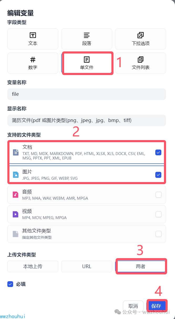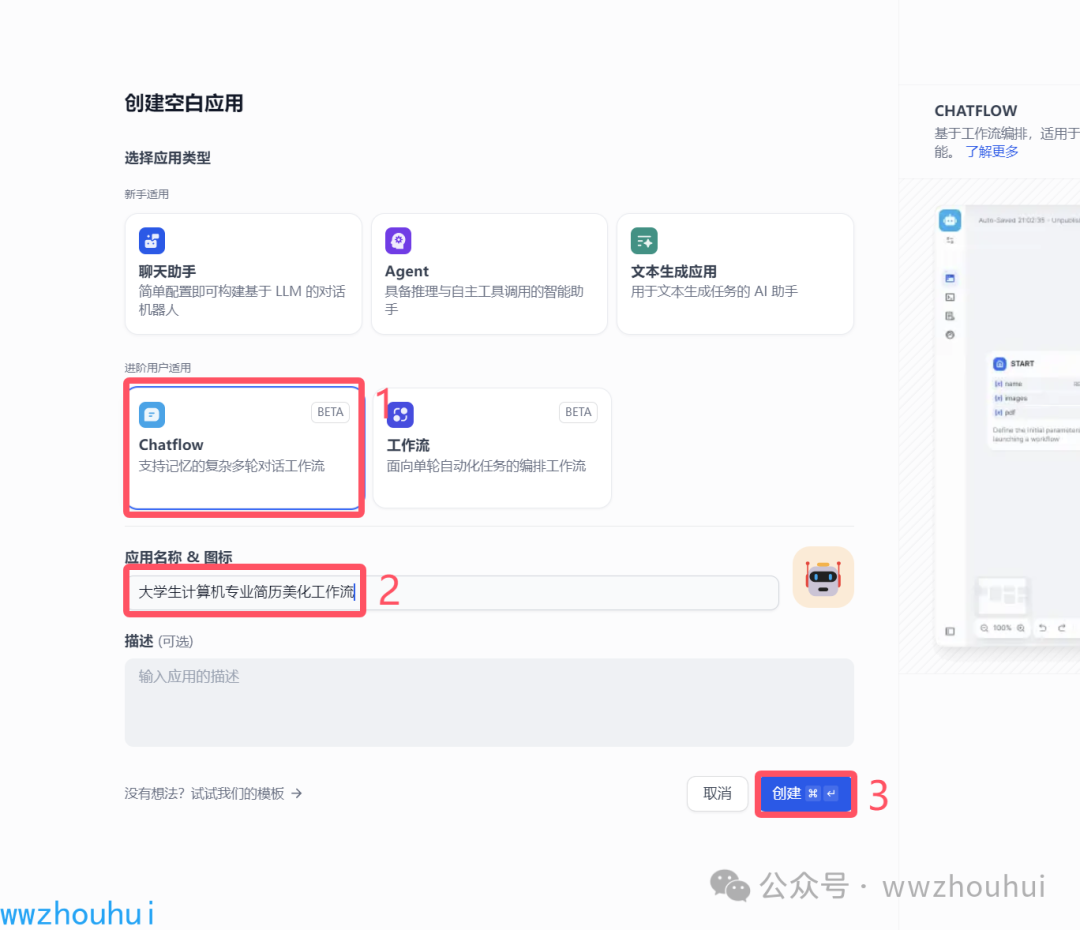 话不多说下面带大家实际操作一下实现这个工作流。 2.工作流的制作首先这个工作流由开始节点、模板转换、条件分支、文档提取器、文本类大模型、多模态大模型、直接回复等组成。 我们首先还是先创建一个chatflow 工作流 开始这个开始节点有一个参数就是文件上传,我们这里选择单个文件,文件类型选择文档和图片
