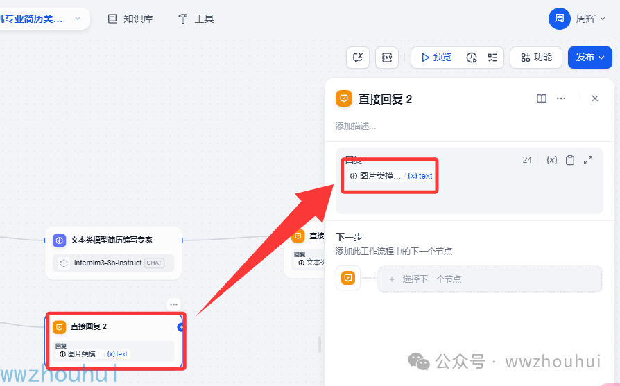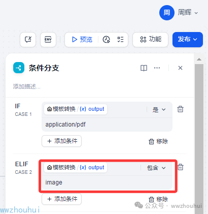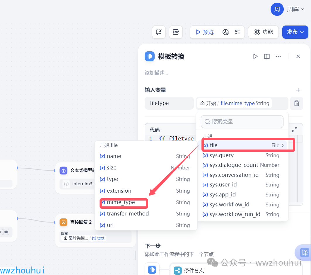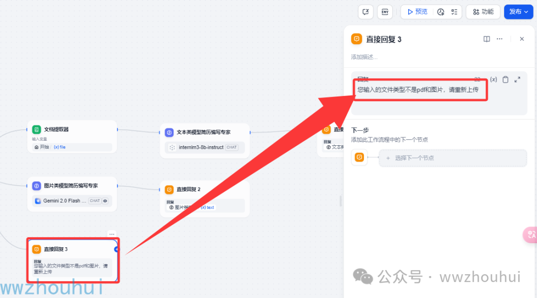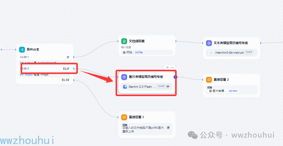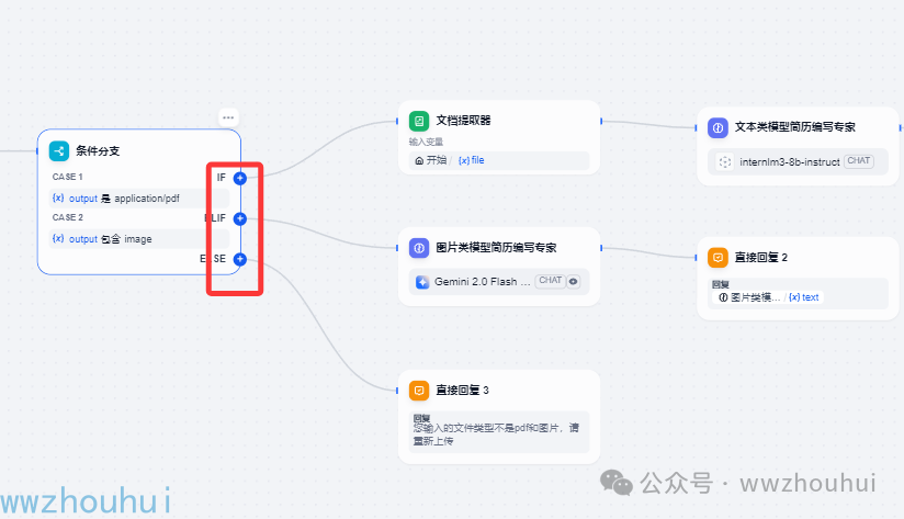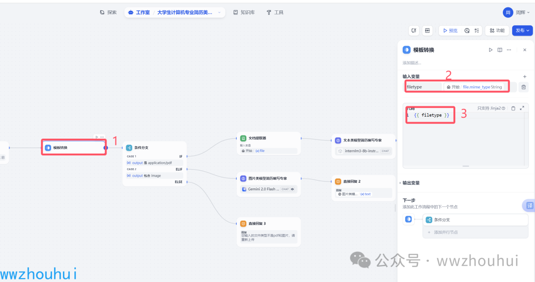 模版转换这个地方我们需要加个模版转换功能来提取上传文件的类型,这样后面我们好做逻辑判断,因为文本和图片处理方式不一样。 我们输入变量用一个filetype来保存文件类型值。这个值我们需要注意是需要提取文件对应的mine_type值 通过上述方式我们就可以提取到类型了。目前我们支持pdf 和图片,所以模版转换filetype 输出值为: application/pdf 或 image/jpeg 条件分支这个条件分支我们判断的条件就是上个 节点中filetype 返回的类型。 条件1:application/pdf 条件2:image 我们通过这个条件判断来区分用上传的是PDF文件还是image 图片 由于PDF文件格式是统一的我们就用 “是”来做判断 而image 它的格式会区分 png、jgeg、jpg、bmp等格式文件,我们这里就用“包含” 关系 这样我就有三个分支节点了 这个时候我们会出现三个条件分支,我们先讲第一个条件分支 文档提取器因为PDF文件是文件格式,我们这里使用文档提取器来提取PDF文件里面的内容 文本类模型简历编写专家这个地方其实就是获取文档提取器里面的内容对PDF文件的内容利用大语言模型来实现简历优化和改进,这里我们用到我们选择书生浦语internlm3-8b-instruct 模型。 系统提示词如下: # 角色:资深简历优化顾问 用户提示词这里我们需要用户传入的文档提取里面的内容给出简历修改意见 请根据用户传入的{{#1742961475478.text#}}给出合理的简历修改意见 直接回复这个地方就是我们输出大模型改写后的简历修改意见内容,给用户输出 接下来我们走第二个分支流程 图片类模型简历编写专家这个地方我们上节if 条件分支,我们使用多模态模型,这里我们为了速度快我们使用了 google gemini2 flash EXP 的模型(支持多模型模型) 由于google 的模型设置和别的模型不太一样。这里我们使用用户提示词在实现简历的修改 用户提示词 # 角色:资深简历优化顾问 因为用了多模态,所以我们把模型视觉开关打开(这个地方需要注意一下,很多小伙伴在用多模型模型的时候这个地方不开启) 另外我们还要注意需要传入file 以上设置完成了多模态模型对简历编写模型设置 直接回复2这个地方就和前面类似,把上面的多模态模型输出结果输出 第三个流程分支。 直接回复3这个地方其实就是在if条件判断的地方让工作流走else分支,万一用户输入的不是PDF 也不是image 就让用户重新输入 以上我们就完成整个工作流的制作。 3.验证及测试接下来我们上传一个带有PDF的简历。 接下来我们在找一个图片的简历 项目地址地址http://dify.duckcloud.fun/chat/tgfX2FmIPAp6Q4pb 生成的DSL工作流,大家也可以在我开源的项目 https://github.com/wwwzhouhui/dify-for-dsl 找到 总结今天,我们主要带大家探索了如何利用 Dify 这一强大的开源平台,实现专业且免费的大学生计算机专业简历美化工作流。对于 PDF 文件,我们使用文档提取器提取内容,再利用书生浦语 internlm3 - 8b - instruct 模型对简历内容进行优化和改进,最后将修改意见直接回复给用户。对于图片文件,我们使用了 google gemini2 flash EXP 多模态模型。本次分享我们实现了一个利用 Dify 平台进行简历美化的工作流案例,希望能帮助大家更好地学习 Dify 工作流的使用。感兴趣的小伙伴可以参考文章内容,自己动手尝试实现大学生计算机专业简历的美化工作。 阅读原文:https://mp.weixin.qq.com/s?__biz=Mzg3OTYzMjc1NQ==&mid=2247486450&idx=1&sn=0e3c5c808ca492e06bb0e863bb96c8e8&scene=21#wechat_redirect 该文章在 2025/5/23 9:29:35 编辑过 |