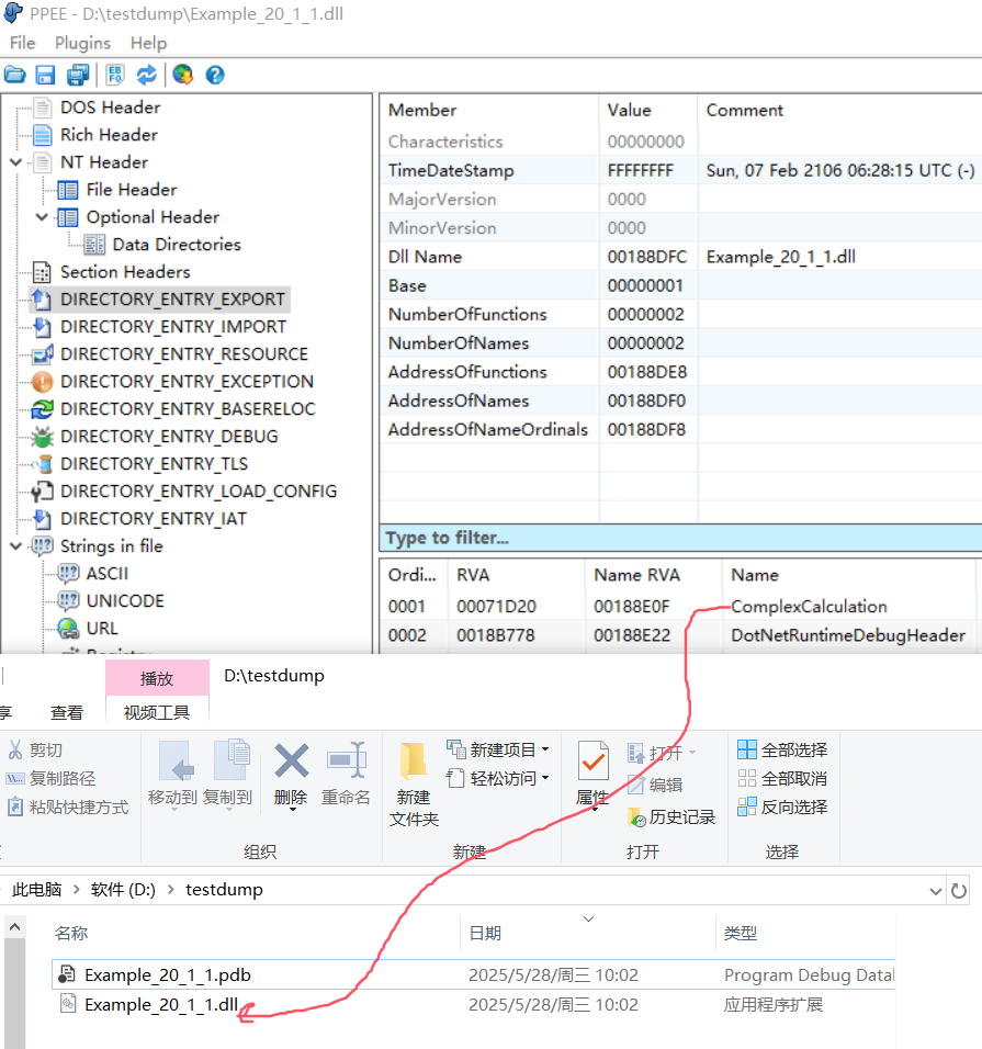 生成好 dll 之后可以用 PPEE 工具观察下 export 表,打开之后果然有了 ComplexCalculation