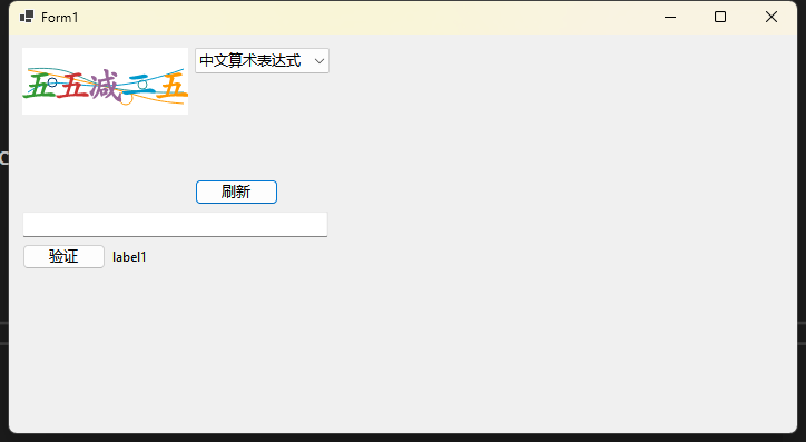 创建一个简单的Winform界面,包含验证码图片显示区域、输入框和验证按钮: