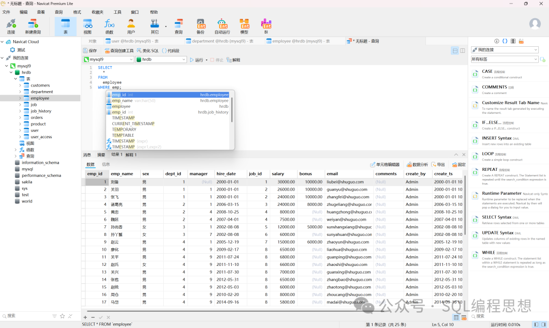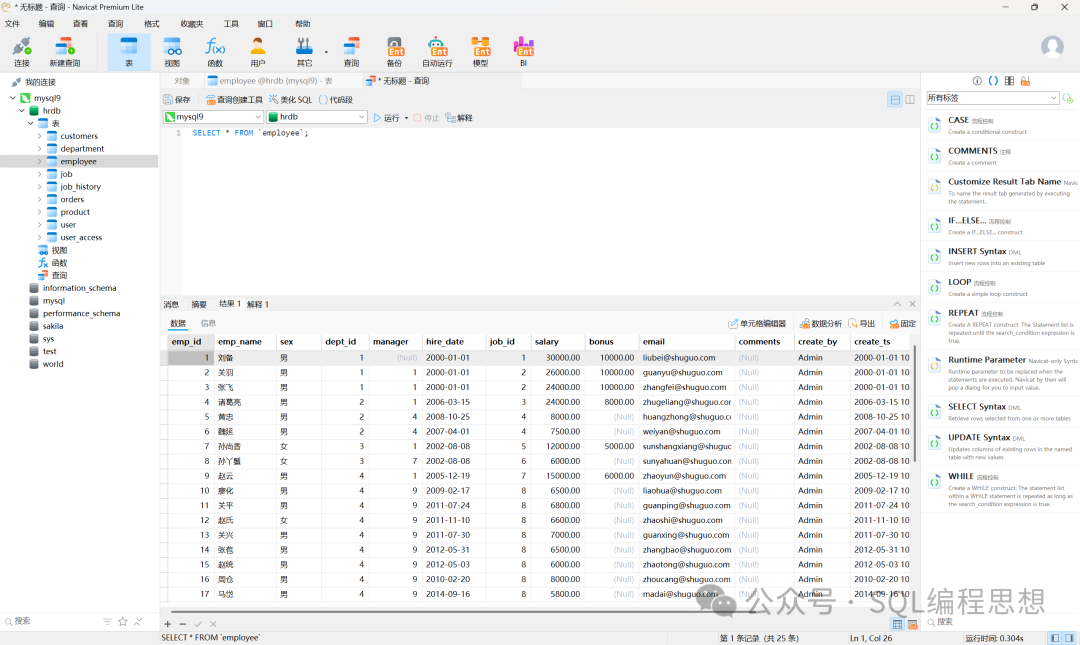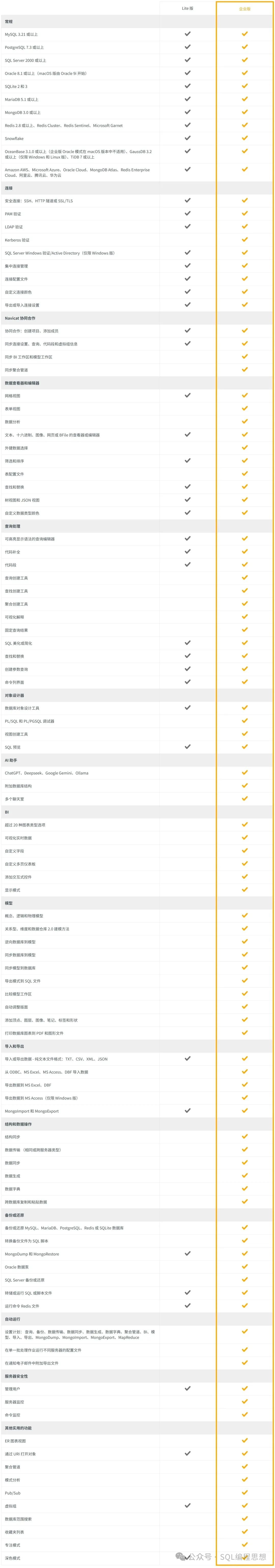 数据源Navicat Premium Lite 允许同时连接到各种数据库平台,包括 MySQL、PostgreSQL、SQL Server、Oracle、MariaDB、Snowflake,以及 Redis 和 MongoDB 等 NoSQL 数据库,所有这些操作都可以通过一个应用程序来完成。此外,Navicat Premium Lite 兼容 GaussDB、OceanBase、TiDB 和 PolarDB 数据库,以及云数据库服务。 Navicat Premium Lite 支持使用 SSH 隧道和 SSL/TLS 进行安全连接,以及 PAM、LDAP、MFA 和 SSO 身份验证方法。 对象设计Navicat Premium Lite 提供了统一的对象设计器,可以管理各种数据库对象和权限,详细设计和查看表、视图、过程等的属性、DDL 语句、依赖关系等。 数据操作Navicat Premium Lite 以类似电子表格的网格视图查看和编辑(插入、编辑、删除、复制或粘贴)表数据,支持排序、筛选、查找/替换等操作。 SQL 开发Navicat Premium Lite 内置了功能强大的 SQL 编辑器,提供语法高亮、代码补全、代码片段、执行计划、格式化等功能,可以方便地编写、编辑、执行 SQL 查询和脚本,并清晰地查看执行结果和消息。 导入导出Navicat Premium Lite 提供向导引导用户完成多种格式(txt、csv、json、xml、sql、html)之间的数据导入和导出,并且允许进行列映射和数据转换。 协同合作Navicat Premium Lite 允许团队实时共享连接设置、查询、模型和虚拟组信息,支持 Navicat Cloud 公有云以及 Navicat On-Prem Server 私有云解决方案。 版本差异相对于 Navicat Premium 企业版而言,精简版限制了不少功能,例如数据生成、数据分析、数据同步、ERD、AI 助手、BI 等,这些功能菜单包含了“Ent”标识。 Navicat Premium Lite 版本和企业版的完整功能差异如下: 下载安装Navicat Premium Lite 支持 Windows、macOS、Linux,官方下载地址如下: https://www.navicat.com.cn/download/navicat-premium-lite 选择对应的平台进行下载并安装。 首次运行需要注册一个免费的 Navicat ID,然后进行登录: 登录之后显示欢迎页面,可以了解一下最新版本功能。 点击”连接“图表或者”文件 | 新建连接“菜单,选择一个数据库类型,例如 MySQL: 输入数据库服务器信息进行连接。 然后就可以开始使用了。 官方网址: https://www.navicat.com.cn/products/navicat-premium-lite 阅读原文:原文链接 该文章在 2025/6/19 18:27:43 编辑过 |