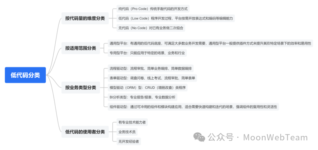 低代码的由来可以追溯到软件开发的演变过程。随着信息技术的快速发展,企业对软件应用的需求不断增加,传统的手工编码方式逐渐显得效率低下,难以满足快速变化的市场需求。 如果有研究过计算机程序语言发展史的同学,应该有听闻第一代编程语言 (1GL)到最新的第六代编程语言(6GL)的蓝图,每一代升级都是生产力的提升,到了第四代其实初见“低代码”的端倪。但是还没有正真提出“低代码”这一概念。 低代码概念需要借助低代码开发平台这一工具实现。维基百科将低代码平台定义为一种提供开发环境的软件,基于低代码平台开发者不需要使用传统的手写代码的方式进行编程,而是可以通过低代码平台图形化的用户界面和参数设置来创建应用软件。 低代码平台面向的用户群体是无需专业开发能力的企业业务人员和一部分专业开发人员。HR 、财务、销售等业务人员完全可以自己或者在技术 人员的指导下开发出更符合特定业务工作需求的应用程序,而专业技术人员则可通过可视化、流程化的开发方式,实现相比于纯代码模式更高效的开发。 单纯从这些公开的信息,其实也无法直观的了解啥是低代码,在笔者看来低代码不是一项具体的技术名称,它是一个技术领域的统称,是属于其中一种程序开发模式。 这个维度下,程序的开发模式可以分为三种:纯代码(Pro Code)、低代码(Low Code)、无代码(No Code) 纯代码(Pro Code)纯代码开发是指使用传统编程语言(如Java、Python、C#等)进行软件开发的方式。开发者需要具备编程技能,能够手动编写代码来实现功能。它的特点具有:灵活性 - 开发者可以完全控制代码的每一个细节,能够实现复杂的业务逻辑和功能;可扩展性 - 可以根据需求进行高度定制,适合大型和复杂的项目;学习曲线 - 需要较高的技术门槛,开发者需要掌握编程语言、框架和工具;维护性 - 代码的可读性和可维护性依赖于开发者的编码习惯和团队的规范。Pro Code 和 No Code 实际上都很好理解,一个是纯代码,一个是无代码。假设 Pro Code 的代码量是 100,那 No Code 就是 0,所以 Pro Code 和 No Code 是截然不同的,甚至你可以认为这两者毫无关系。No Code 的最典型形态莫过于 SaaS 类的产品了。 低代码跟无代码概念容易混淆,如果按照公式来表达的话: C,Configuration in graphical,图形化配置,这是大家对低代码最直观的认知部分。通过各类常规的UI手段,如窗口、对话框、文本框、下拉框等编辑器等UI交互形式引导用户表达信息。 A,Arrangement in graphical,图形化编排,基于图元或其他形式的节点信息,通过连接、排布等方式表达流程、时序等信息。 T,Textual DSL,文本型的DSL,借助某种文本化形式的特定领域语言做描述表达,可能为表达式或其他计算机语言,一般谈“低代码”中的代码指的主要是这部分内容。 低代码的构成公式 无代码的构成公式 低代码平台可以分为专用型和通用型两种 所谓通用,指的是开发平台不事先假设自身只能应用在特定的场景、业务、行业,而是具有广泛的适用范围。具有这样特征的开发平台往往需要有一个通用的底座。这个底座是纯技术性的,它不依赖于特定的业务功能,而只与业界广泛使用的标准协议、技术标准产生耦合。不过,这个时候,我们只有深入平台架构实现的细节,才能判断平台到底是低代码还是无代码,这就导致平台的使用者难以甄别。 但是,通用是有代价的,越通用就往往意味着在特定业务场景下的效率越低,越通用就意味着默认配置里的个性化信息越少,为形成某个具体场景所需的配置量就越大,从这个具体场景的角度看,效率相应也就越低。 所以通用型的低代码平台往往伴生着这个特征:有相对完善的有插件(或类似)机制。这一点相对来说比较好识别,相对高通用性的技术底座来说,插件是廉价的,因此通用性低代码平台往往会有数量众多的插件。这些插件可以定制出各式各样具体的业务场景,通过插件的定制化和扩展性来解决效率问题。 2.3. 按业务类型来分类 其实,在一个具有较高通用适用范围的低代码平台来说,按照业务类型分类几乎是没有意义的。之所以不得不按输出程序类型分类,是因为开发平台的通用性不足,而在有了足够高的通用适用性之后,支持开发各种类型 App 的问题,就不在于能不能了,而只是时间问题。 按照业务类型区分大概有流程驱动型、表单驱动型、模型驱动(ORM)型、BI 分析、组件驱动类型这几种,具体你可以看看这张表格(5 星为满分): 这里,主要区分一下表单驱动型和模型驱动型这两个类型,因为它们比较容易混淆。 所谓模型驱动型 App,它的模型指的是数据模型,或是数据关系。而这里所说的关系,指的就是符合三范式的关系型数据库的关系,也就是你数据库中各个数据表之间的关系,比如表 1 的 a 字段和表 2 的 a 字段是相同的,但与表 3 中的 a 字段没有关系。在正确配置了各种数据关系之后(这个过程一般称为数据建模),页面上就可以很容易创建各种 CRUD(增删改查)类页面了。 表单类页面则是仅以数据为中心,创造各种表单来收集或呈现数据。这里的关键点在于,这类页面并不关注数据之间的关系。所以表单类的页面非常容易形成数据孤岛,并存在大量冗余数据,以及大量数据不一致性等问题。如果我们将表单类页面做得比较完善的话,实际上它就会逐渐转型成模型驱动类页面了。在完成数据建模之后,我们就分