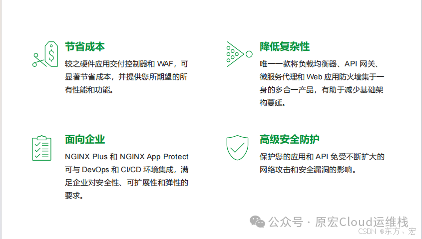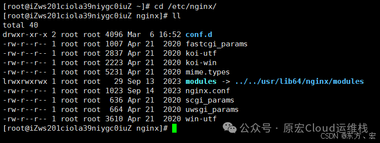 Nginx 主配置文件,定义全局参数(如工作进程数、日志路径等)。 文件是 NGINX 守护进程使用的默认配置入口点。此配置文 件能够为 worker 进程、调优、日志记录、动态模块的加载以及对其他 NGINX 配 置文件的引用设置全局设置。在默认配置中,/etc/nginx/nginx.conf 文件包括顶层 http 代码块,也就是上下文,它提供了下述目录中的所有配置文件。