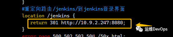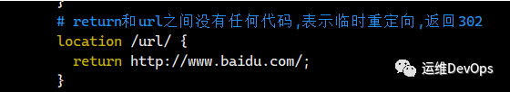本例子中使用Nginx和Jenkins来作为演示,他们都部署在同一台机器上,端口分别为80和80801.1、下面例子使用第一种参数将url永久重定向到jenkins页面,如图:注意:return后面的http地址结尾有没有”/”都没关系,因为只要匹配了路径/jenkins就会请求过来接下来通过http://10.9.2.247/jenkins来请求,可以看到已经重定向到jenkins页面,如图:1.2 、下面例子是使用第二种参数将url重定向到百度页面,如图:此时通过浏览器访问http://10.9.2.247/url/ 将重定向到百度页面,查看返回状态码,如图:1.3、下面例子是使用第三种参数,返回状态码和文本,如图:通过浏览器访问http://10.9.2.247/test 将下载test文件,查看此文件内容如下:注意:return后面只有是200的时候才会下载,其余的不会return在server和if中用法基本差不多,不再过多演示