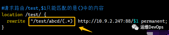 从上图看出,当请求路由为/test,实际是跳转到了httpd根路径下的test目录的index.html文件,为什么会这样呢?因为rewrite中的正则(.*) 前面并无其他内容,因此此时匹配的就是上面的路由test,而$1正好对应的是(.*)的内容,因此实际请求路径就变成了10.9.2.247:88/test注意:在rewrite的正则中,如果有$1、$2,那么实际匹配的是()中的内容,比如: