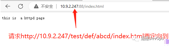 浏览器中输入http://10.9.2.247/test/abcd/index.html,实际重定向的路径是http://10.9.2.247:88/index.html,因为$1匹配的只是()中的内容,如图: