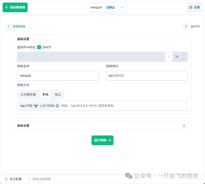 我们只需要配置一个网络名称和密码,保持默认的公共服务器配置,点击运行网络,就完成操作了!