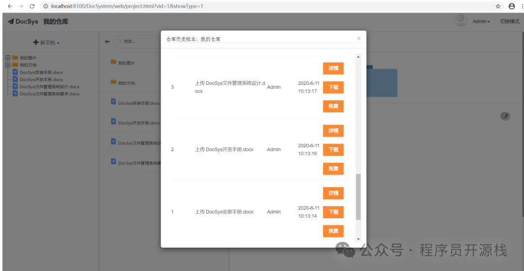 整个系统模块化设计清晰,便于功能扩展和维护。 项目体验 项目效果部署完成后,用户可以通过浏览器访问 MxsDoc 的 Web 管理界面,进行文件上传、下载、编辑、分享、搜索等操作。 系统界面简洁直观,操作逻辑清晰,即便是初次使用的用户也能快速上手。文件管理功能完善,支持多仓库管理,每个仓库可独立配置权限、加密策略、备份规则等。 在协同办公方面,Office/WPS 文件的在线预览和编辑功能非常实用,无需依赖本地软件即可实现多人协作。AI 功能的接入也使得知识库内容的搜索与处理更加智能化。 集群部署的支持,使得系统在企业级应用中也具备良好的扩展性和稳定性。 多仓库支持支持定义各自的文件存储、版本管理、权限管理、全文搜索和文件加密规则 存储更安全本地化文件存储方案,避免系统意外损坏对仓库文件造成影响 历史版本采用目前最流行的SVN和GIT版本仓库,支持增量历史版本管理,支持脱离MxsDoc系统进行访问 在线编辑支持各种文本文件在线编辑,支持Office/WPS文件协同编辑,无任何外部依赖(无需安装和部署其他Office编辑软件或系统) AI大模型接入支持接入Deepseek、Ollama等多种AI大模型,让知识库更加智能 文件分享支持文件和目录分享,支持访问权限设置和密码访问控制 全文搜索支持文件名、文件备注、文件内容搜索,让文件查找更加快捷方便 后台管理支持用户管理、用户组管理、仓库管理、系统管理 集群部署支持热插拔式集群,服务器可随时加入或退出集群,支持参数一致性检测,无需人工检查 项目源码源码托管在 GitHub 和 Gitee 上,便于开发者下载、学习和二次开发。 GitHub:https://github.com/RainyGao-GitHub/DocSys/releases Gitee :https://gitee.com/RainyGao/DocSys 项目包含完整的安装包、升级包和部署说明,适合不同阶段的开发者使用: