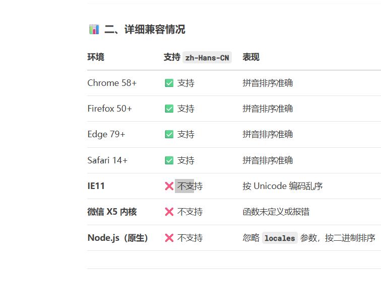 如:localeCompare函数在X5内核(android版的微信浏览器)的浏览器不兼容该函数,请注意使用。