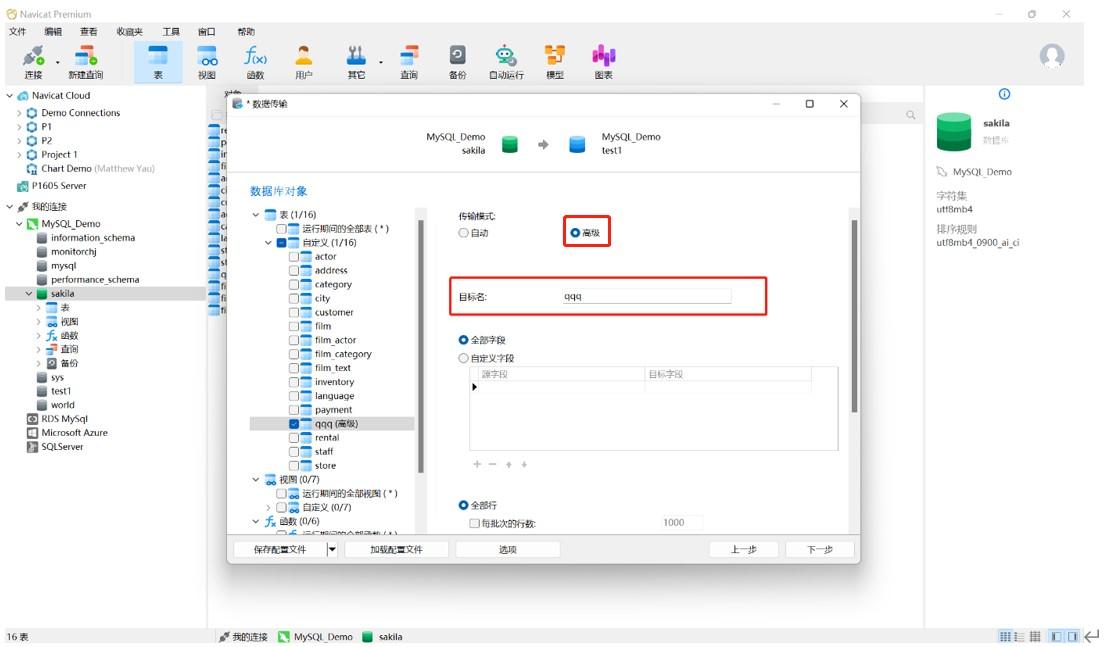 7、若选择“高级模式”。在高级模式中,可以对传输到目标数据库中的表进行重命名。