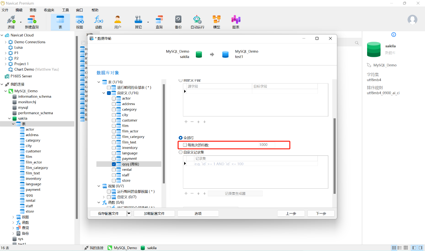 9、“每批次的行数”是指定每批次传输的数据行数以将数据分批次传输。不勾选此项,Navicat 则将数据作为单个事务发送到目标服务器。