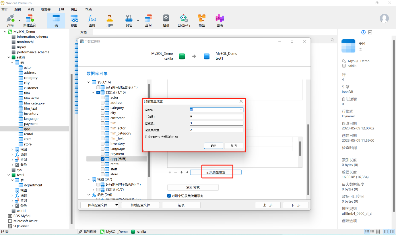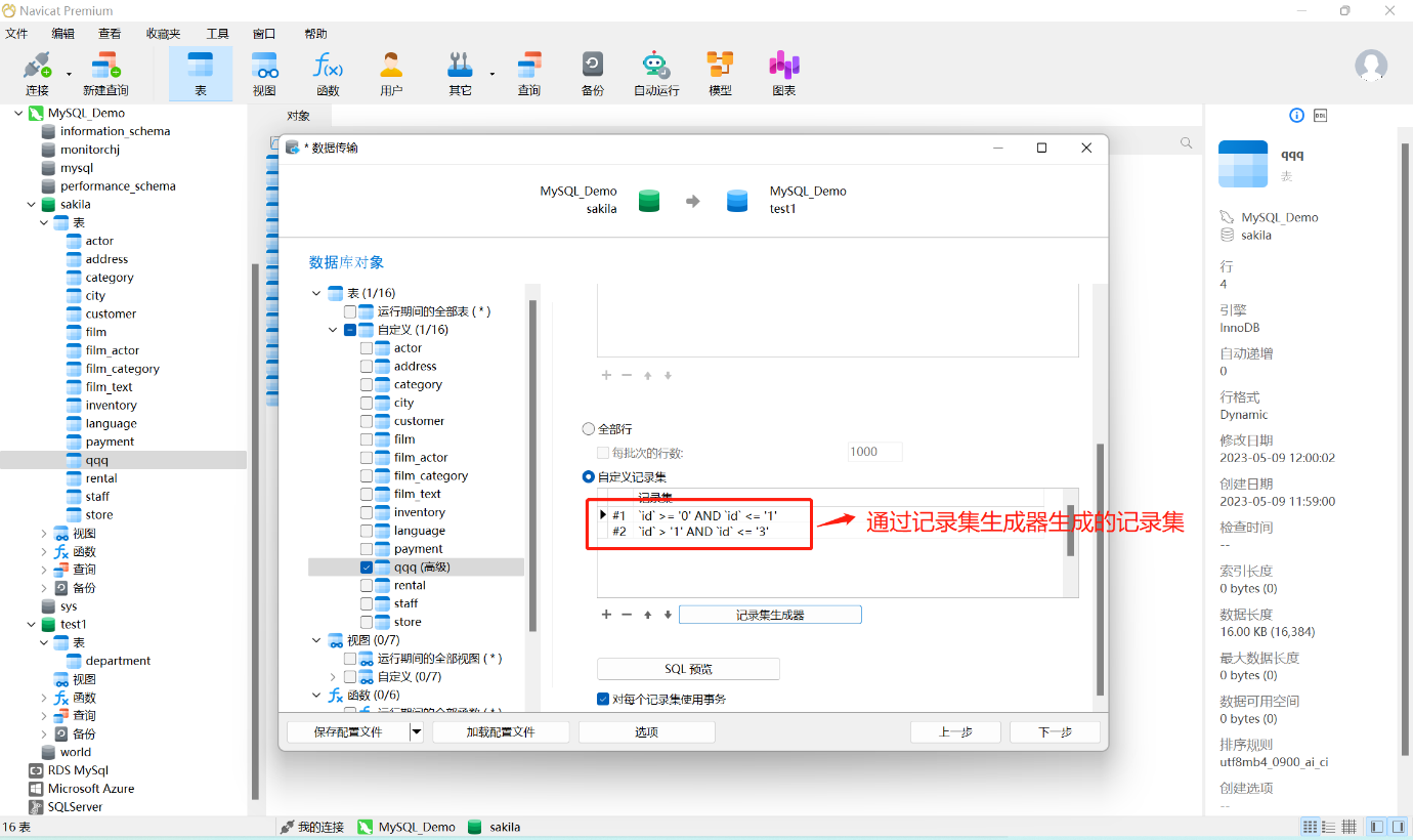 11、“记录集生成器”通常是在传输的表很大的时候会用到,将需要传输的表的记录的分为多个记录集来传输,以避免连接超时影响传输。“记录集生成器”会在设置的范围内均匀地将记录分为多个记录集。