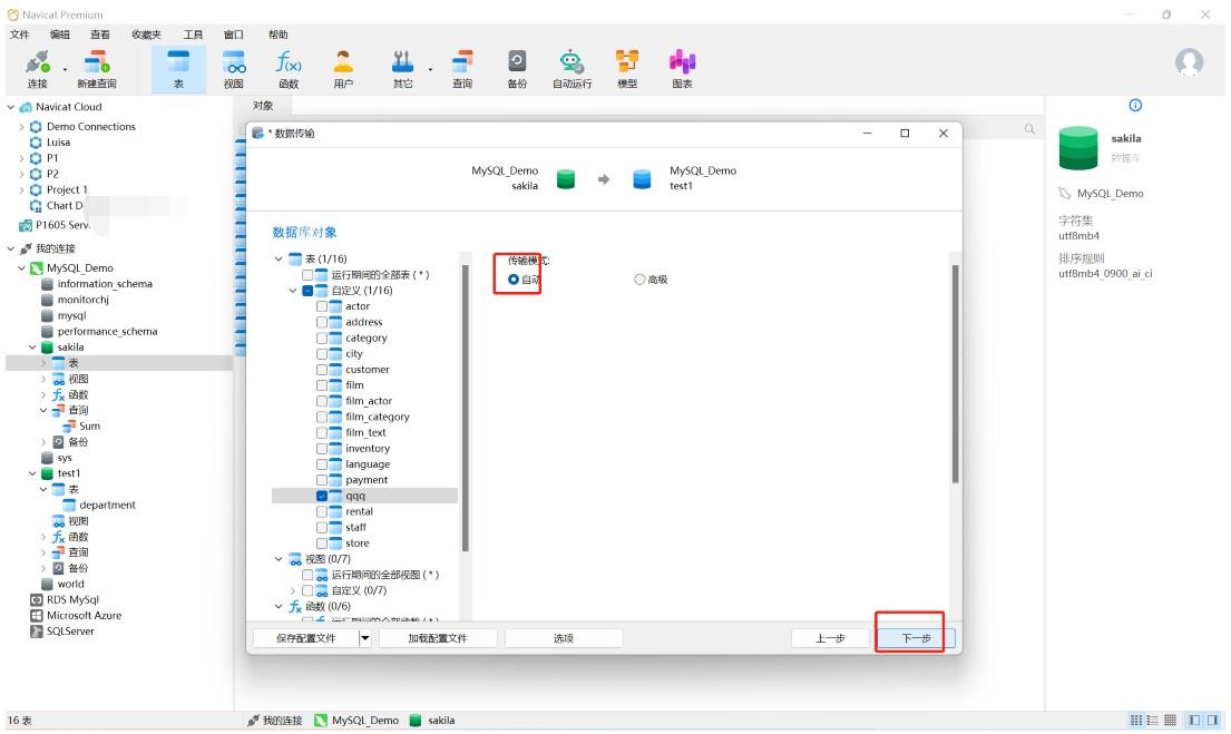 6、点击到勾选的表,右侧会显示两种传输模式:自动和高级。选择自动,Navicat 将使用默认设置进行传输。