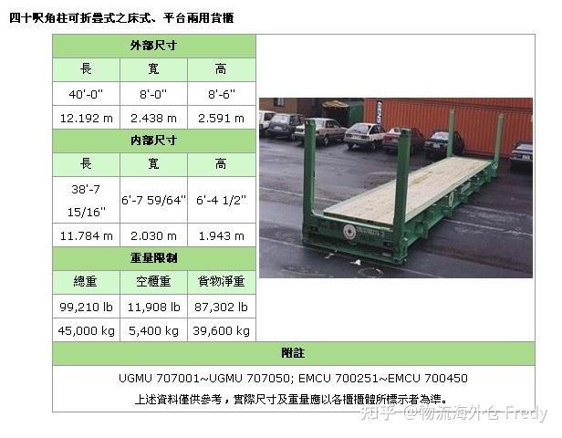 备注:集装箱适用于装载大型货物和重货,如钢铁、木材,机械,特别是像玻璃板等易碎的重