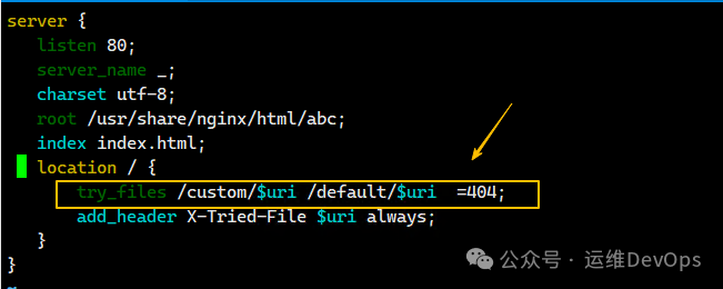 变量),查看响应头信息,可以看到X-Tried-File,如图:3、检查静态文件是否存在,不存在直接返回404,如图:请求gong.txt,既不存在此文件也不存在此目录,因此直接返回404,如图:4、访问页面,直接返回状态码,适合维护页面,如图:在abc目录下定义maintenace.html(名字要与nginx配置名字一致),然后通过192.168.49.83请求,如图:上面配置理解为:如果请求/hello,那么匹配/custom/hello,如果匹配不到就继续匹配/default/hello,如果都匹配不到就返回404(1)、在abc目录下新建custom目录并在内部创建gong.txt文件,新建default目录并在内部新建guan.txt,通过url请求,如图: