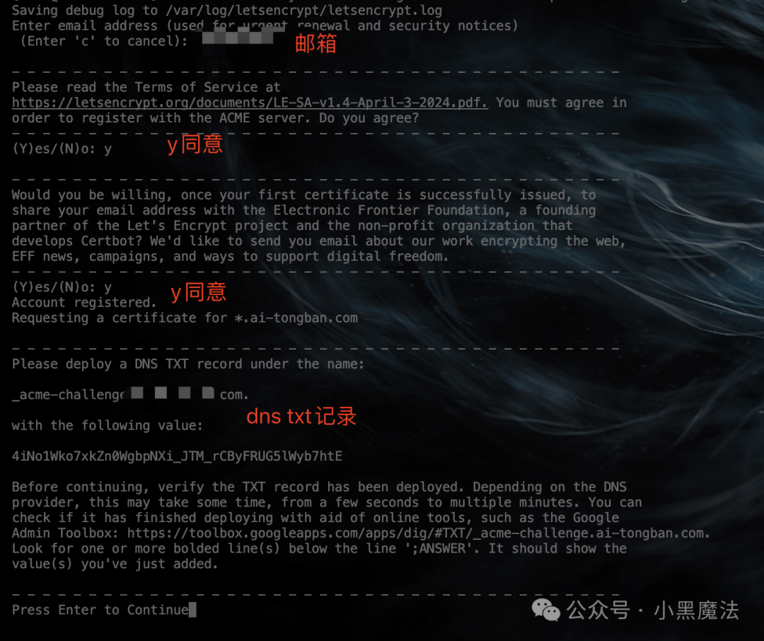 - - - - - - - - - - - - - - - - - - - - - - - - - - - - - - - - - - - - - - - -Press Enter to Continue  # 参考下图设置完域名解析后,并且确认txt记录解析正常后,按回车就可以生成了,记住一定要先解析设置完成后再回车,然后生成的证书信息如下: