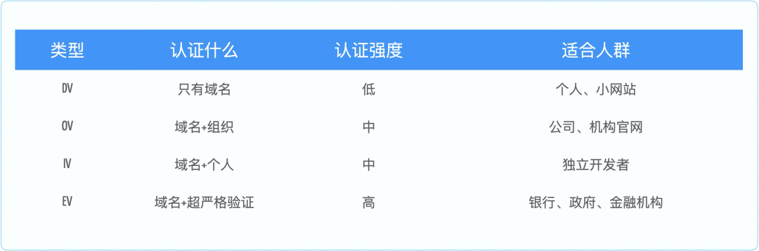 上面是常见的证书类型,对于我们的场景,应该选择DV证书,用来给我们自己的域名做认证。