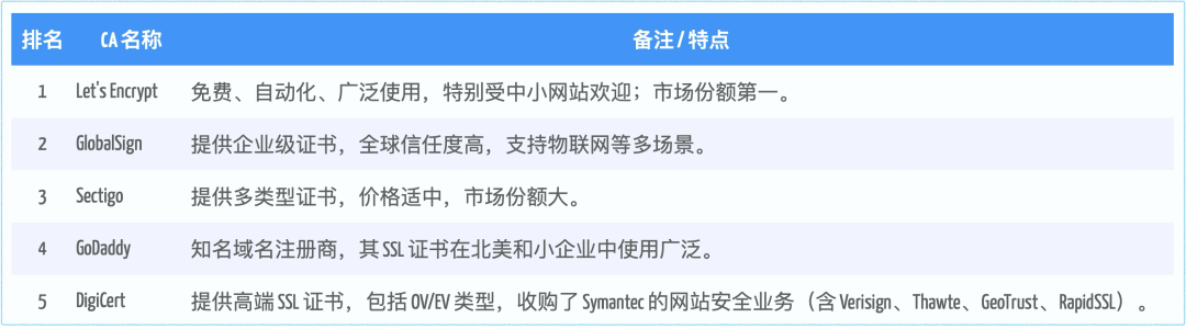 Let's Encrypt是目前(2024年)市场份额第一的,甚至美国政府网站在也使用它,免费方便,支持自助申请。只是免费的证书有效期最多3个月,到期需要更新。它也提供了自动化的命令行工具来更新证书。