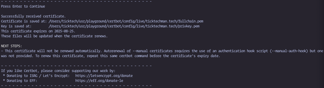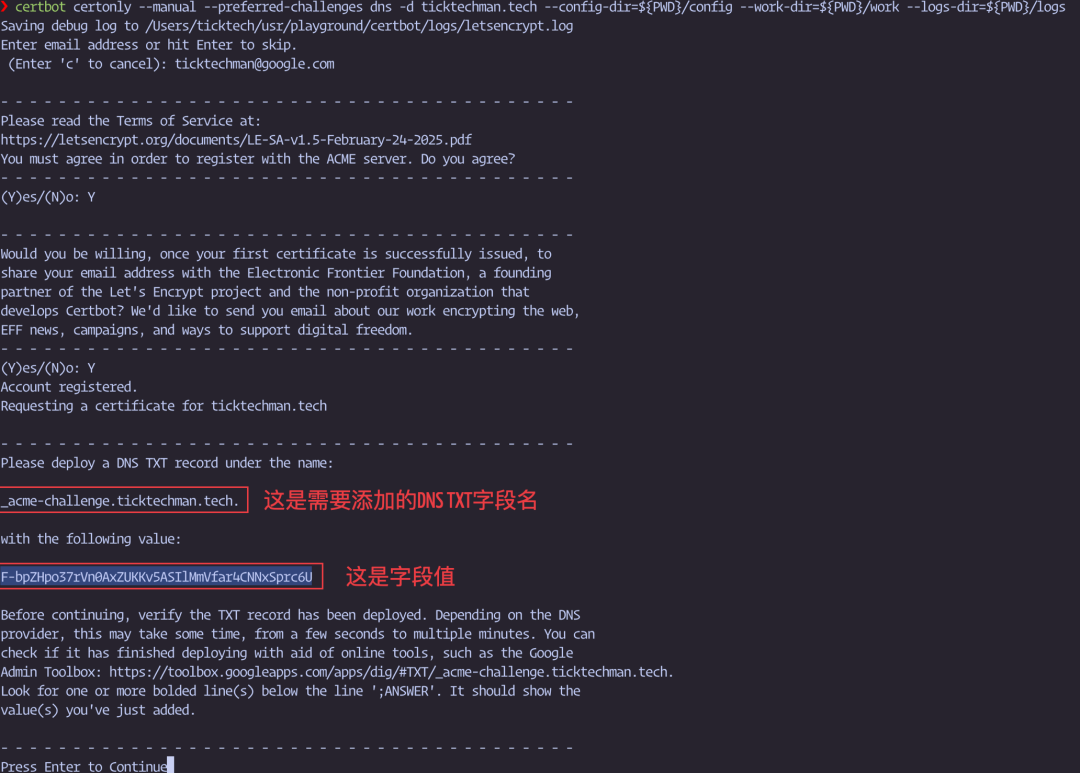 certbot certonly --manual --preferred-challenges dns -d ticktechman.tech --config-dir=${PWD}/config --work-dir=${PWD}/work --logs-dir=${PWD}/logs