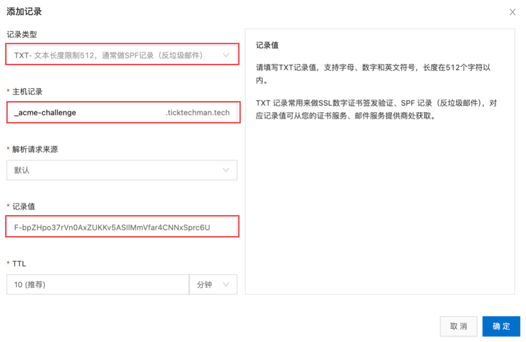 执行到这里的时候,需要在DNS中增加TXT字段,字段名是固定的,字段值是临时生成的,需要手动添加。这里以阿里云平台上添加DNS TXT字段为例介绍:红框中前两项按照上图中填写,第三项【记录值】要输入上步中命令行输出的字段值。添加成功后,需要等待一段时间才能生效(建议等待2~3分钟)添加完DNS信息后,按【回车】键继续后面的申请操作