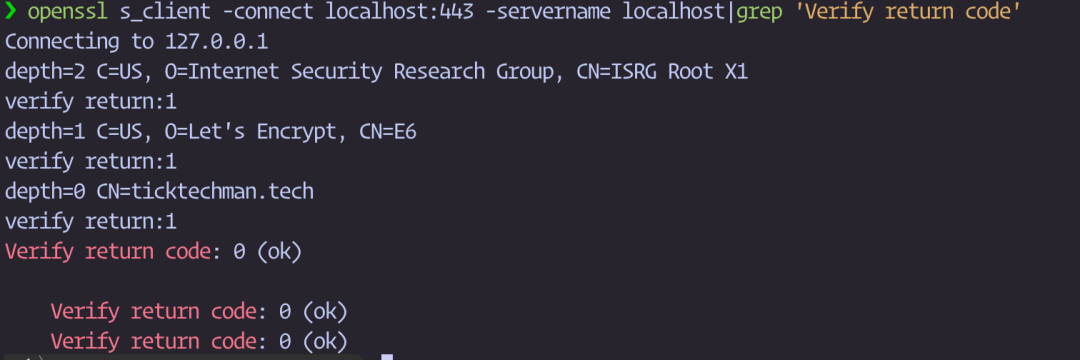 openssl s_client -connect localhost:443 -servername localhost|grep 'Verify return code'