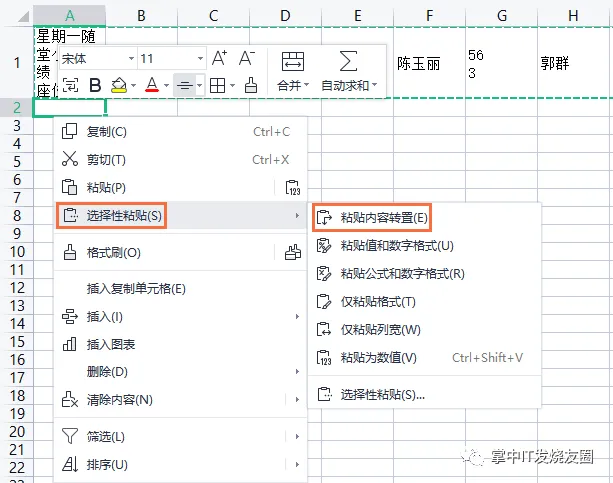 03. 这样数据就被分成一个个窗格了,如果你想要让数据变成竖向的,可以全选复制,将光标移动到【选择性粘贴】,点击【粘贴内容转置】就可以了。