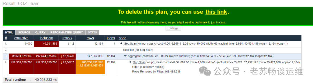 前言使用过Oracle的SQL Monitor的朋友都知道,它能够将复杂的SQL执行计划解析为直观的HTML可视化报告。清晰展示查询的执行路径、耗时分布及资源消耗,帮助开发者快速定位性能瓶颈,如表扫描、索引缺失、JOIN效率等问题。对于诊断慢SQL,该工具提供分析支持,大幅提升数据库调优效率。那对于PostgreSQL数据库,有没有类似的工具可以用来分析呢?答案是肯定的,那就是Depesz EXPLAIN ANALYZE visualizer,我们看一下它的使用方法。 在线访问方式可以直接访问:https://explain.depesz.com/ ![]() 本地搭建方式当然除了在线访问,你可以本地部署,以下是本地部署步骤。 安装Docker环境(此处略过Docker安装步骤) 克隆项目源码git clone https://gitlab.com/depesz/explain.depesz.com.git 拉起镜像进入项目docker目录并启动容器: cd docker/ 若出现镜像拉取超时: # docker-compose up --build 解决方案:更换Docker镜像源 编辑配置文件: cat /etc/docker/daemon.json 内容如下: { 重启Docker服务: systemctl daemon-reload && systemctl restart docker 验证部署查看运行中的容器: docker ps 正常输出示例: CONTAINER ID IMAGE PORTS NAMES 若服务卡住,可尝试: docker-compose start 访问服务成功启动后访问: http://[你的服务器IP]:3000 ![]() 使用方法使用方法简单:第一个标题随便输入,第二个空栏贴上您的执行计划,接着点提交,即可基于当前的执行计划生成一份HTML的报告。 ![]() ![]() 用红色背景高亮显示,是我们的重点观察对象。 最后的stats列是SQL的总览信息 转自:https://mp.weixin.qq.com/s/sS8ucKBpzmgt_T85mZW_fQ 该文章在 2025/8/19 10:26:39 编辑过 |