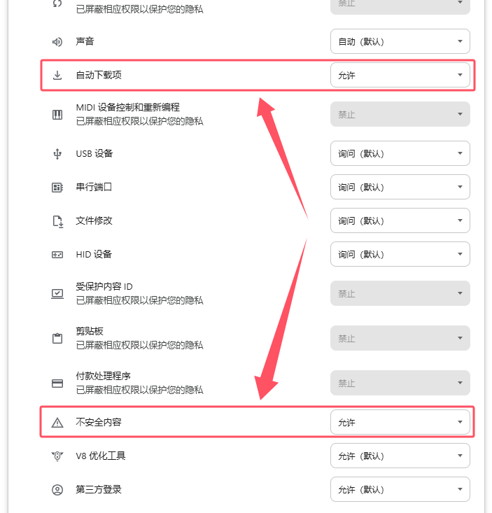 4. 在弹出的新标签页中,找到“自动下载项”、“不安全内容”这两项。